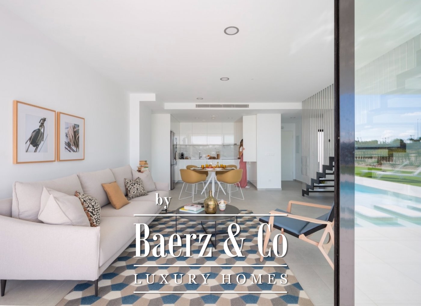 Villa Baños y Mendigos rises within the tranquil enclave of Altaona Golf Resort, Murcia. This new build villa in Baños y Mendigos offers 218 m² of living space on a 1,000 m² plot, defined by its connection to open air, natural light and the quiet rhythm of golf resort living. The villa features three bedrooms and three bathrooms, complemented by a guest toilet. An open plan kitchen forms the heart of the home, flowing directly to spacious living and dining areas, with expansive glazing framing the views to a private garden and pool.