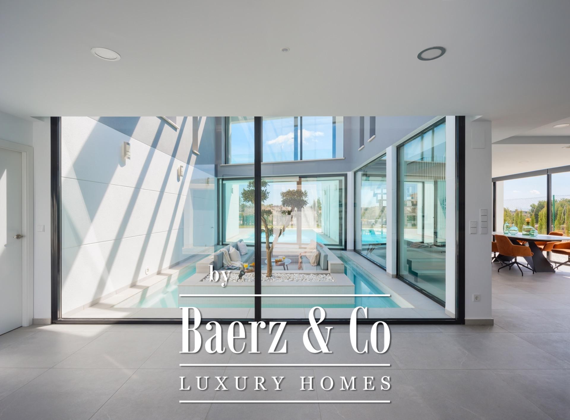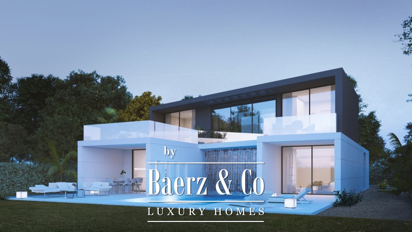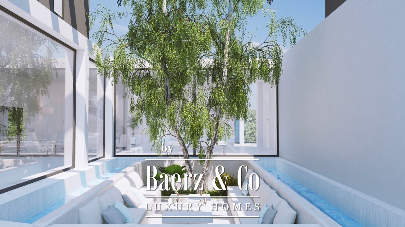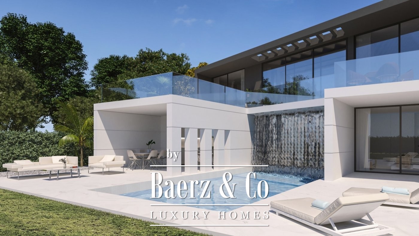 The villa is arranged over two floors and provides four bedrooms and four bathrooms, each suite with built-in wardrobes and access to private terraces. The open kitchen and living area establishes a calm, inviting central space. From here, direct access to the garden and pool invites private leisure or evenings with friends.