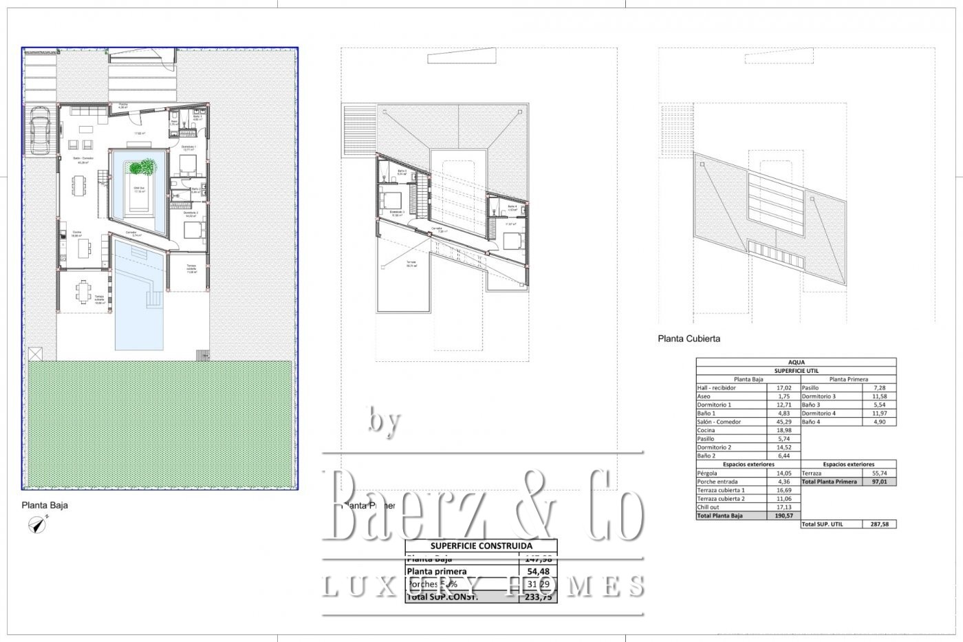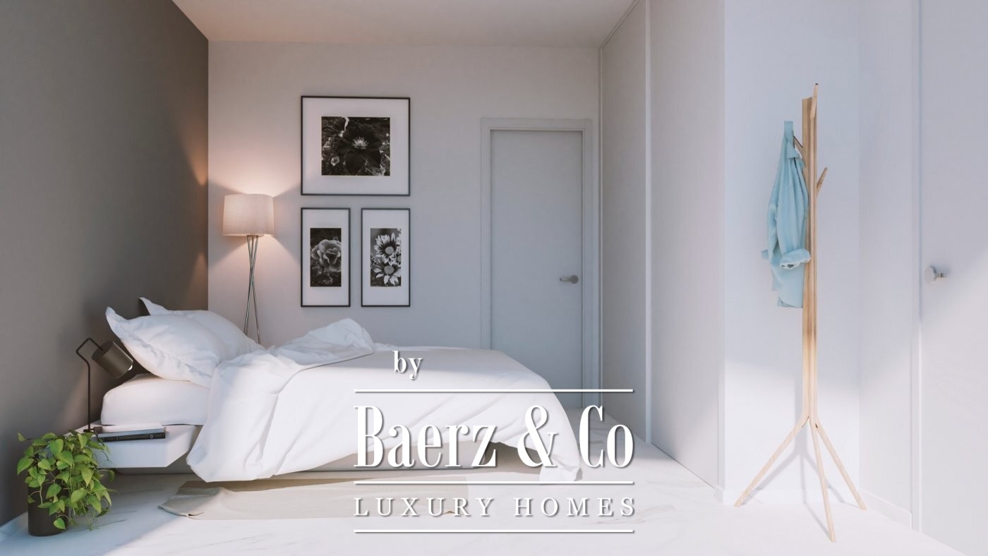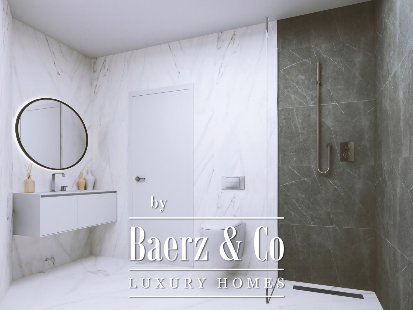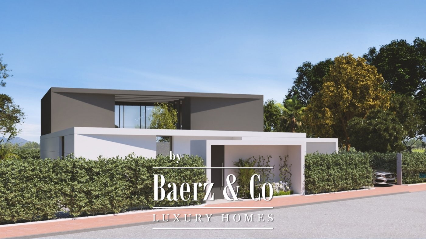 The villa is arranged over two floors and provides four bedrooms and four bathrooms, each suite with built-in wardrobes and access to private terraces. The open kitchen and living area establishes a calm, inviting central space. From here, direct access to the garden and pool invites private leisure or evenings with friends.