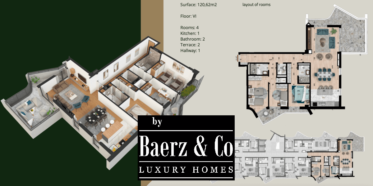 ware, first-class oak flooring, high quality wall paints, video surveillance intercom, alarm system, as well as split-system air conditioning. The building stands as a timeless sculptural work of art, perfectly located in the harmonic place and with an extensive planning process and design in every cubic millimeter of space, to meet the needs of every tenant and make him feel comfortable every day in his new home. The building is dressed in a high-quality demit facade, metal fences on the terraces and the highest quality materials on the market. The harmonious variations of colors and materials create a recognizable identity.