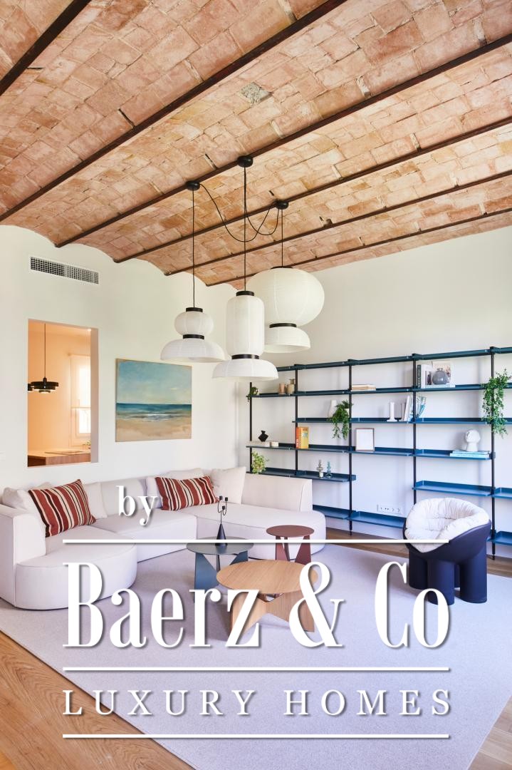 The property offers a master suite with a walk-in wardrobe and a balcony overlooking a quiet inner courtyard. All bedrooms are double, each featuring its own en-suite bathroom. Living spaces are defined by 2.40-meter-high Catalan vaulted ceilings in the entrance and hallway, and original molded ceilings preserved in the lounge and bedrooms. Flooring layers original ceramics and hydraulic parquet for subtle texture and understated elegance.