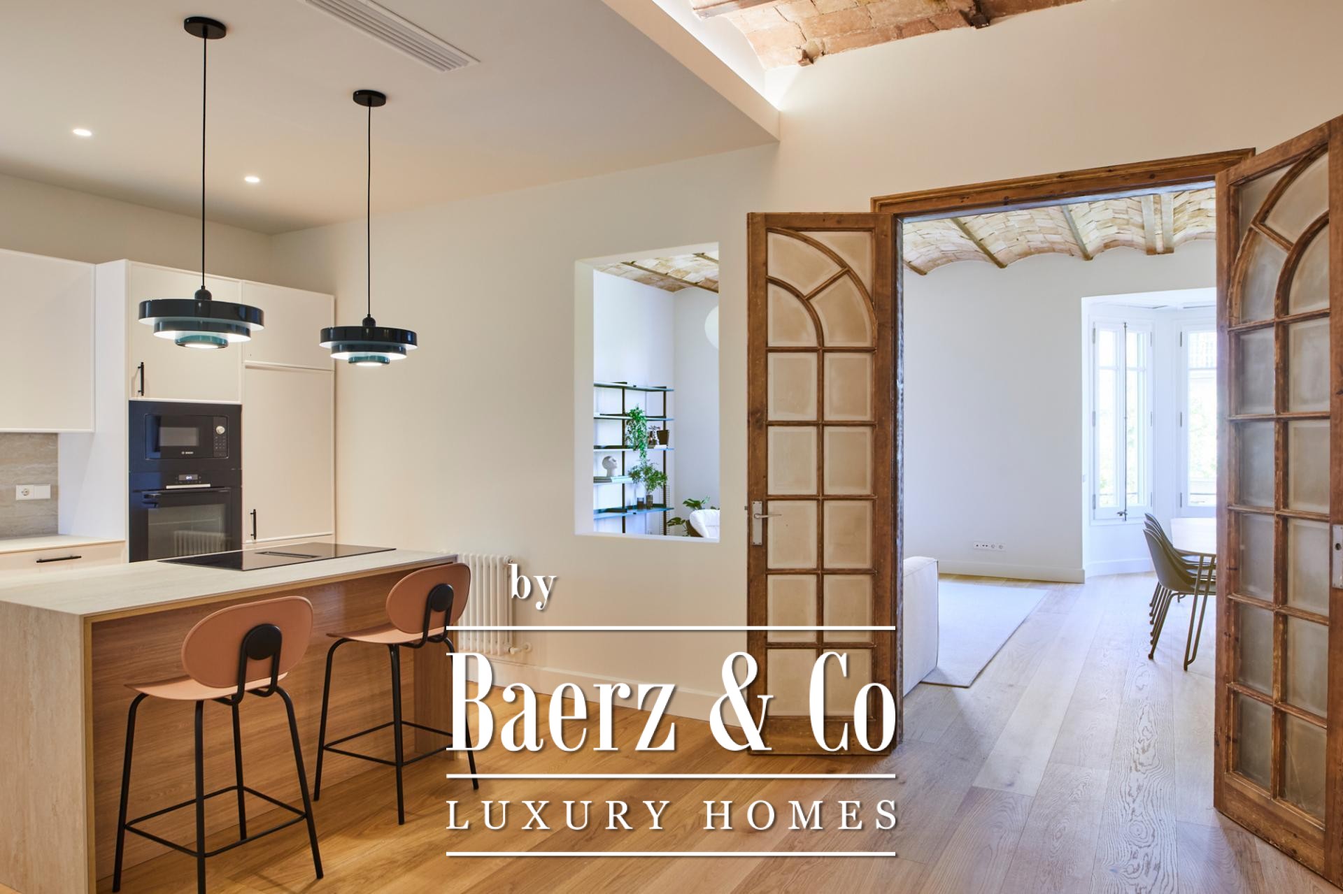 Abundant daylight filters through south-facing balcony windows illuminating the main living area. High-end finishes underscore the commitment to quality, harmonising the original architecture with modern simplicity. The residence is quietly positioned yet within immediate reach of central Barcelona's cultural and urban offerings, with elevator access for added convenience. For those seeking an apartment in Barcelona that balances heritage with present-day comfort, a detailed report on premium fittings is available upon request.