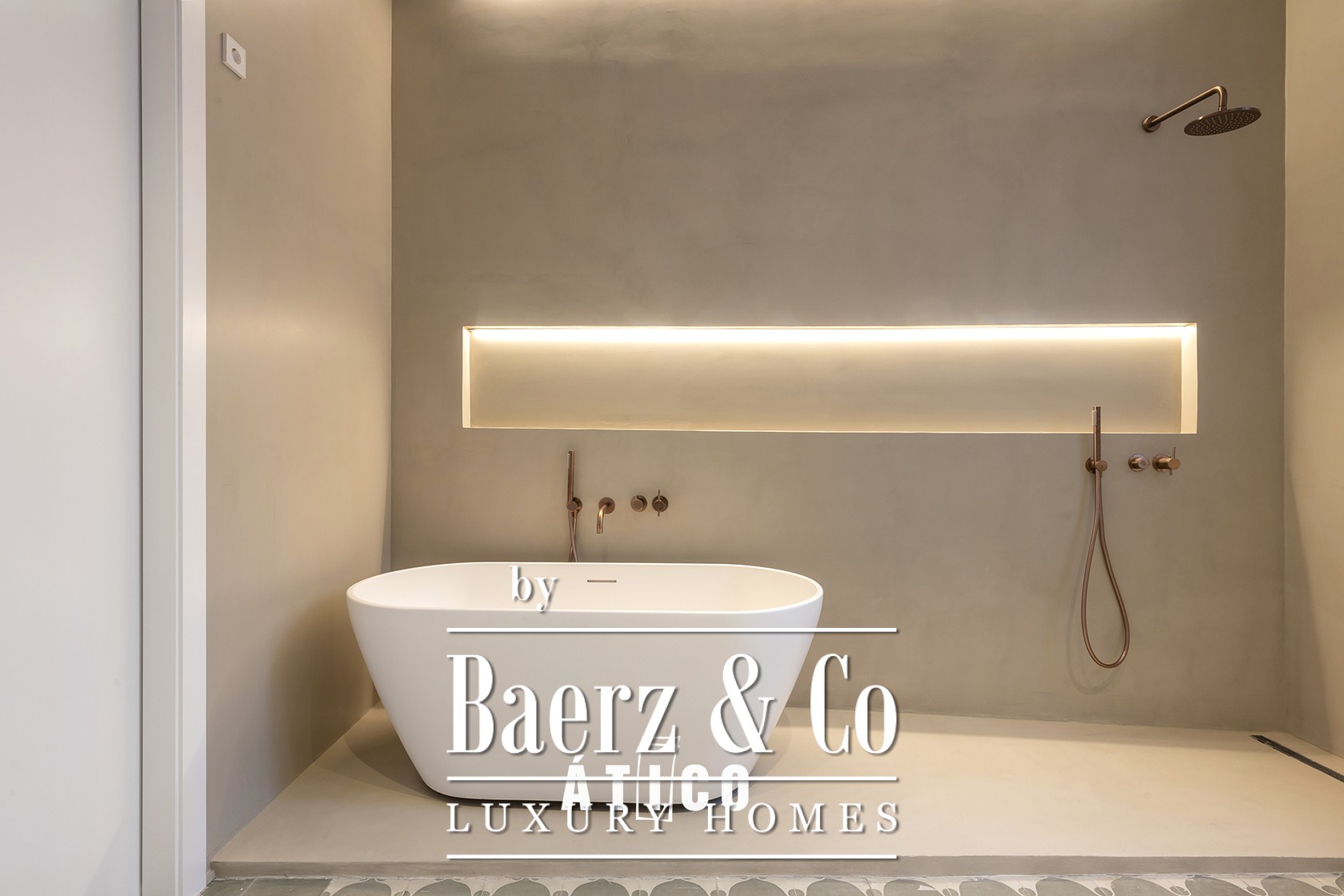 The kitchen, equipped with Miele appliances, is seamlessly connected to the living area, offering solid wood craftsmanship and an open rhythm for both daily living and entertaining. Energy efficiency is prioritized with an aerothermal system and A energy certificate, supported by discreet air conditioning.