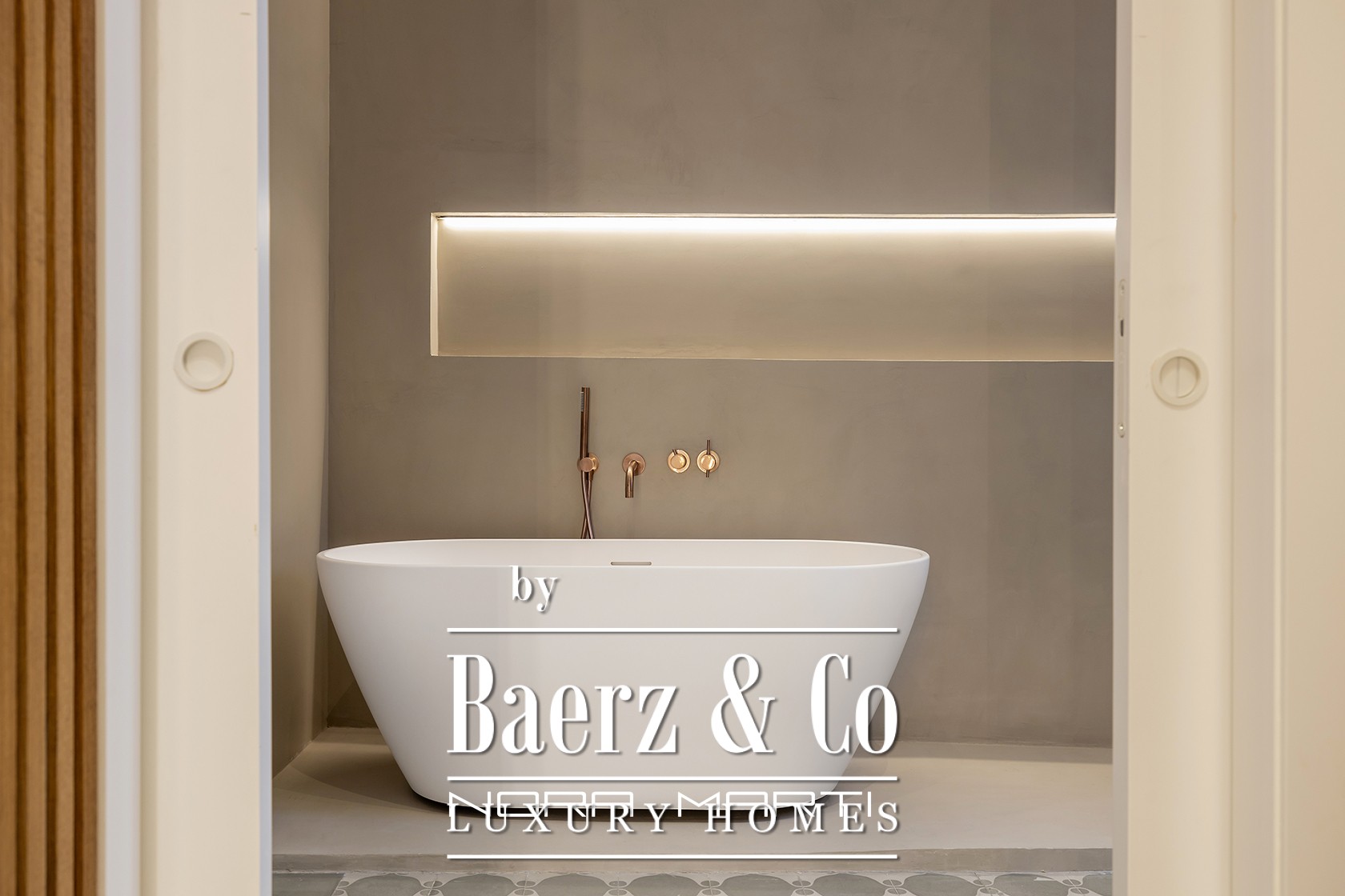 Three bedrooms define the private quarters, anchored by a master suite with en-suite bath and dressing room. Two additional bedrooms share a generous second bathroom. The living area flows openly, with a handcrafted solid wood kitchen, appointed with Miele appliances, designed for both intimacy and sociability. Noia flooring adds subtle texture beneath your feet, while luxury finishes and air heating, paired with energy efficiency rated A, deliver genuine comfort throughout the seasons.