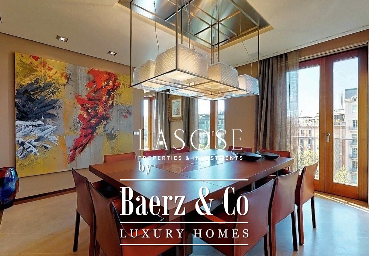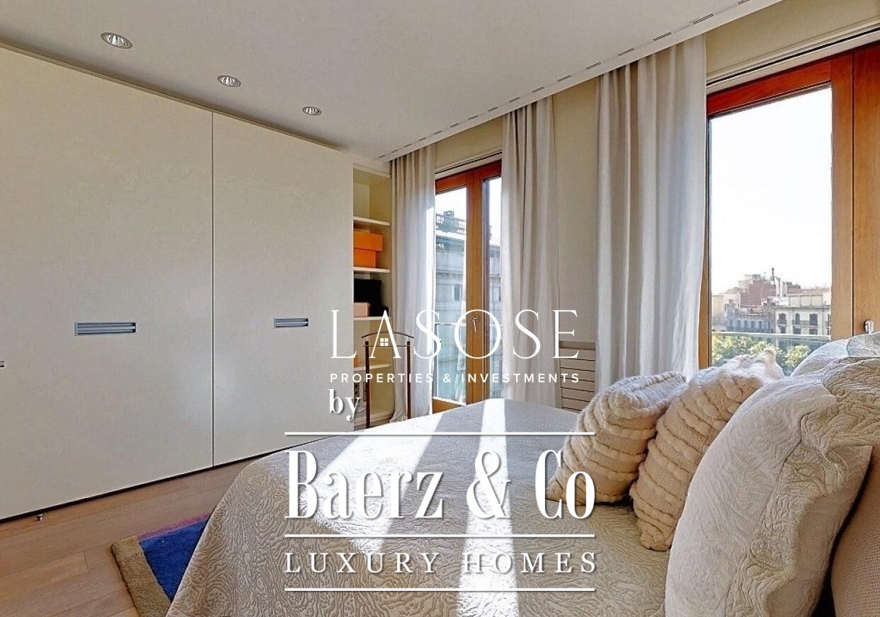 Lasose Properties presents a stunning property for sale in Passeig de Gracia with 180º panoramic views thanks to its beautiful location in a corner building. This spacious apartment offers exceptional brightness and proportionate open spaces, all of them exterior.. . The property consists of:. . 3 bedrooms (including 1 Master Suite with bathroom and dressing room).. 3 bathrooms. 1 toilet. 1 large living room with incredible view on the street. 1 professional kitchen with dining room + 1 pantry. 1 library. It also includes 2 storage rooms and 2 parking spaces in the price.. . This property is located in one of the most emblematic buildings of Passeig de Gracia, built in 2002 but preserving its majestic entrance. The building
