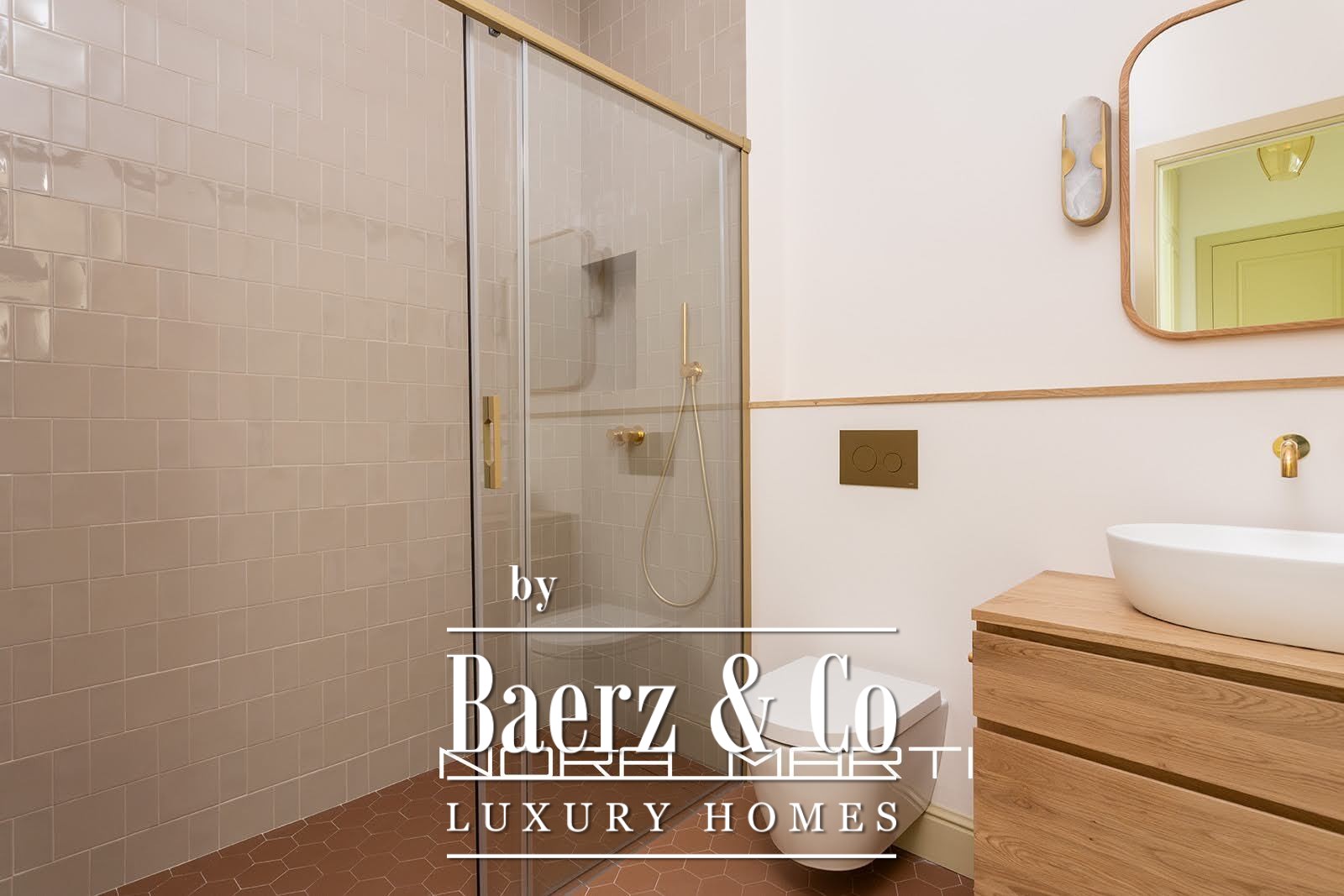 The luxurious renovation focuses on quality and detail while preserving the building's original features and charm. A Catalan vaulted ceiling is visible throughout the apartment, enhancing the feeling of spaciousness and light. The ceiling transforms the living room into a truly exceptional space, featuring handcrafted local tiles and floor-to-ceiling windows that open onto a tranquil terrace; this room is unique and the heart of the living area.