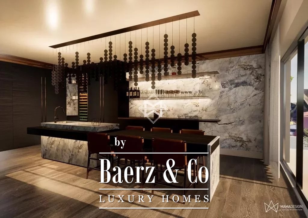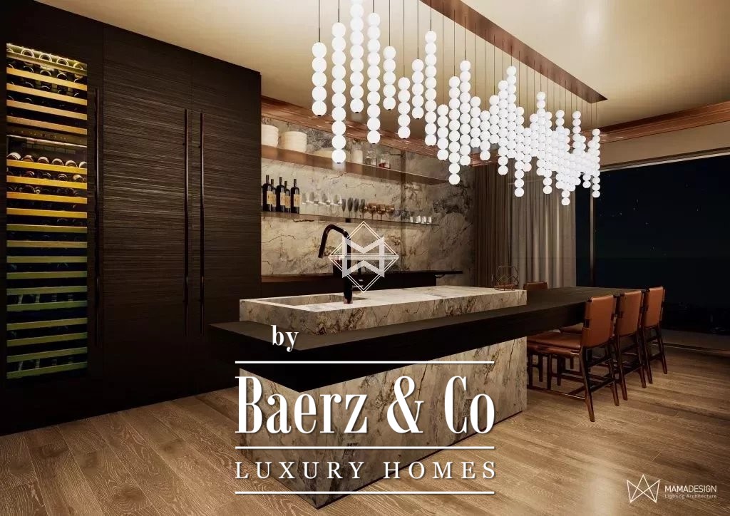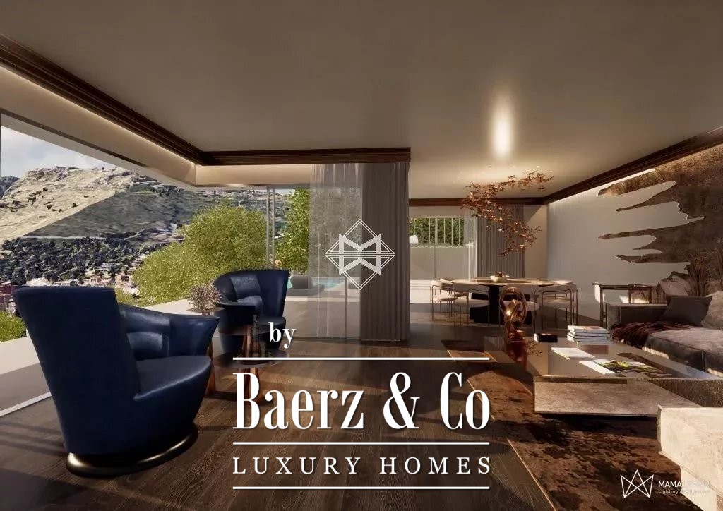 The ground floor level has 190 m2 of open floor plan. Several large sliding windows open onto a large balcony leading to the garden and the infinity pool.