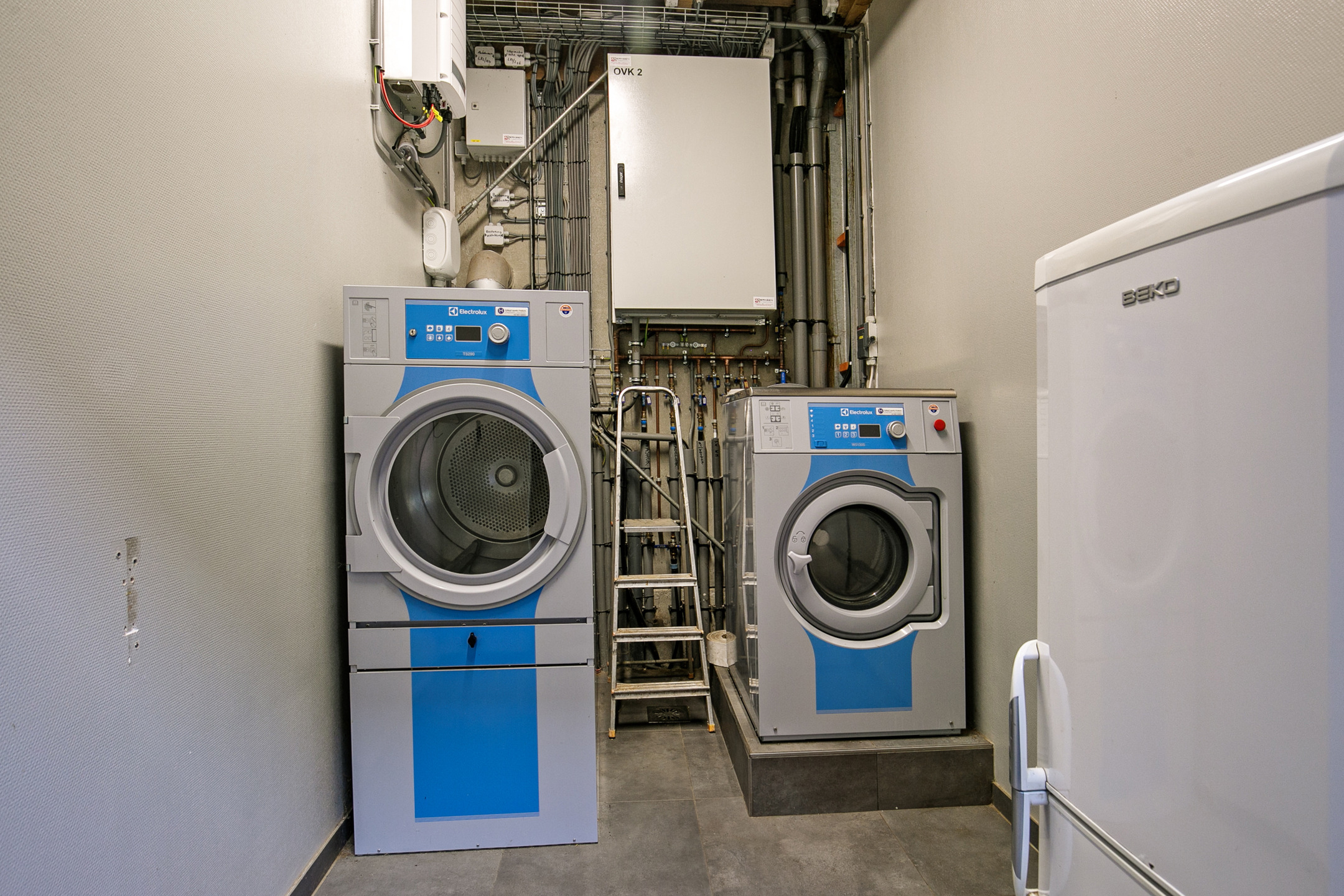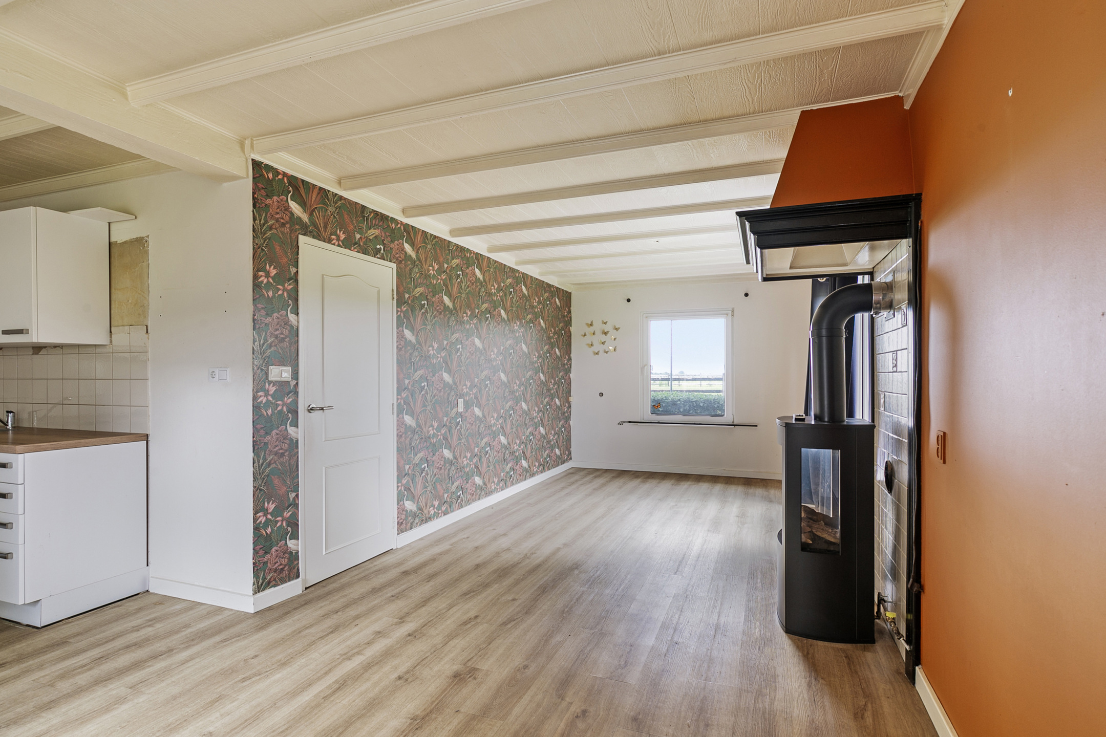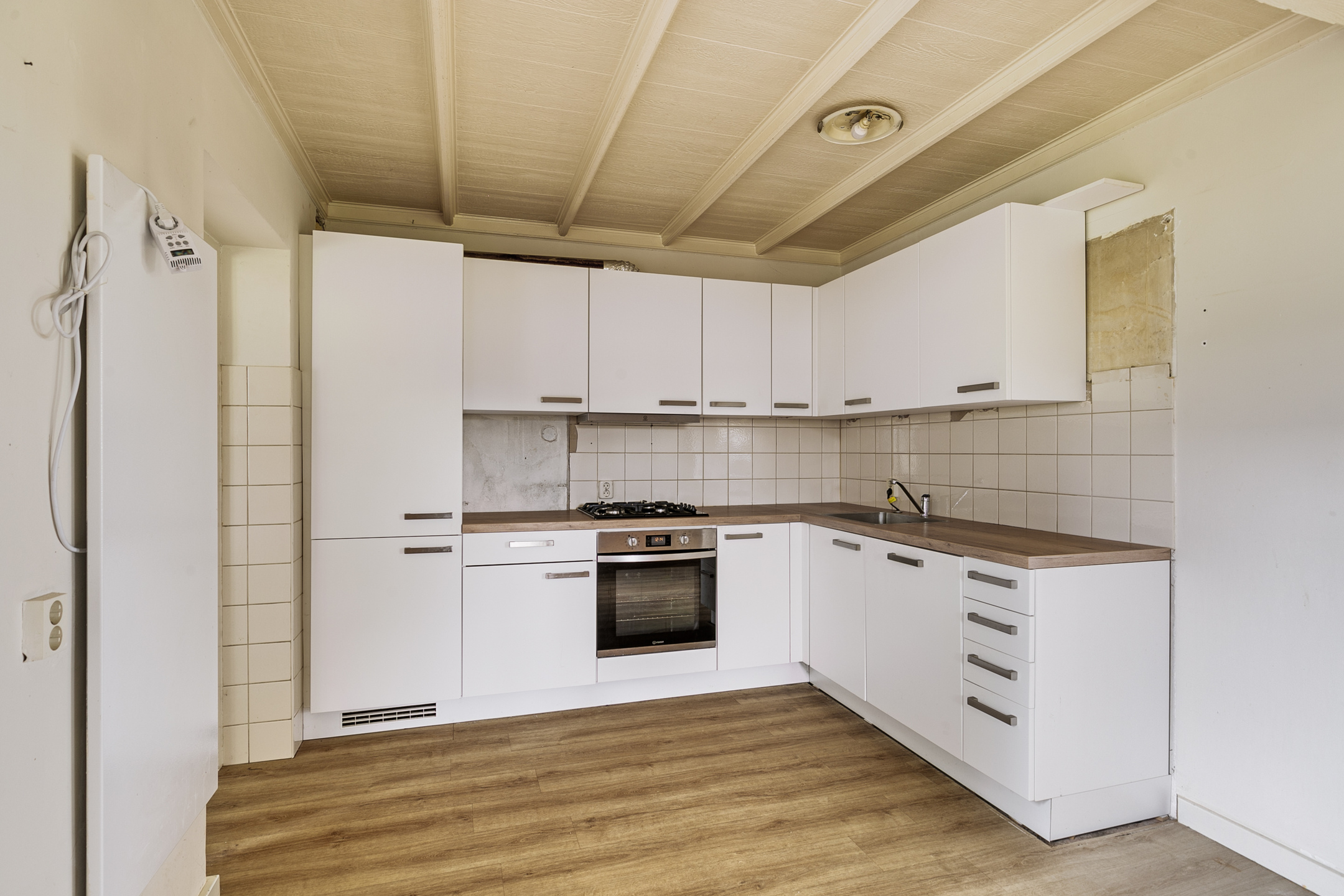 The right-hand section of the house was completely renovated in 2019. This part is arranged on the ground floor with a hall, a living kitchen, a spacious living room, a bathroom, laundry room, toilet room and a cellar cupboard. The hall has a tiled floor, stucco walls and a stucco ceiling. The meter cupboard and a closet with storage space are located in the hallway. The pleasant living kitchen is in open connection with the adjacent living room and is equipped with a corner kitchen layout. This kitchen unit is equipped with a sink, an electric cooker with an oven, a microwave, a dishwasher and a fridge. A large window above the worktop offers a nice view of the accommodation and provides plenty of light. Room-high windows in the side and rear elevations also provide a sea of light in the living room. In addition, a wicket door provides access to the rear garden. The living room is finished with a tiled floor, stucco walls and a stucco ceiling. There is also a large closet wall with sliding doors with plenty of practical storage space. The fully tiled bathroom is fitted with a bathtub, a walk-in shower and a wide washbasin with a storage cabinet. The stucco ceiling has recessed lighting.