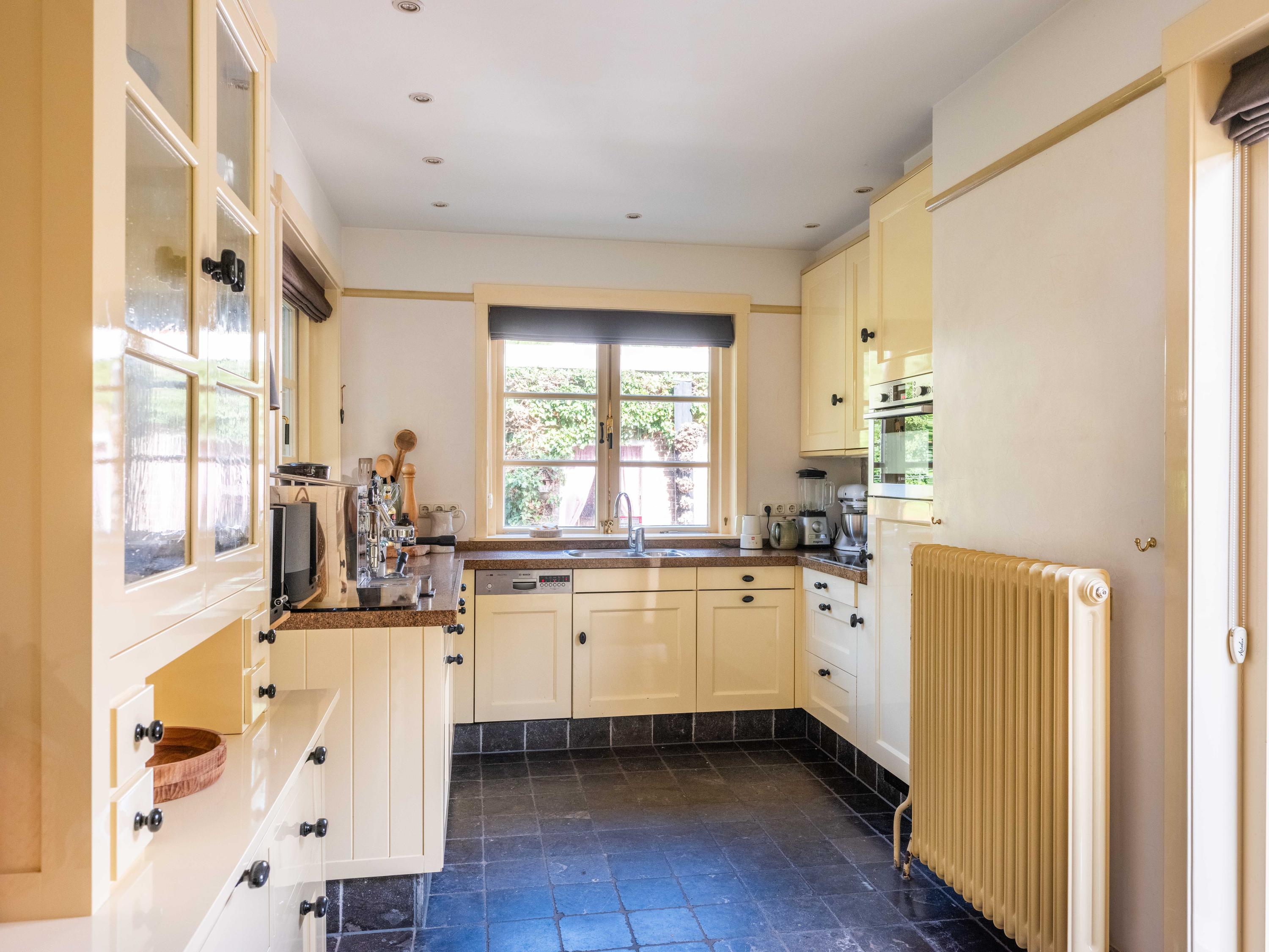 You enter this charming house through the red front door and intermediate hall with meter cupboard. The hallway with stairs to the first floor, a toilet and a large pantry under the stairs, continues into the kitchen. This is equipped with various built-in appliances including ceramic hob, combination microwave oven, fridge and dishwasher. The kitchen is also accessible from outside via a door at the side of the house.