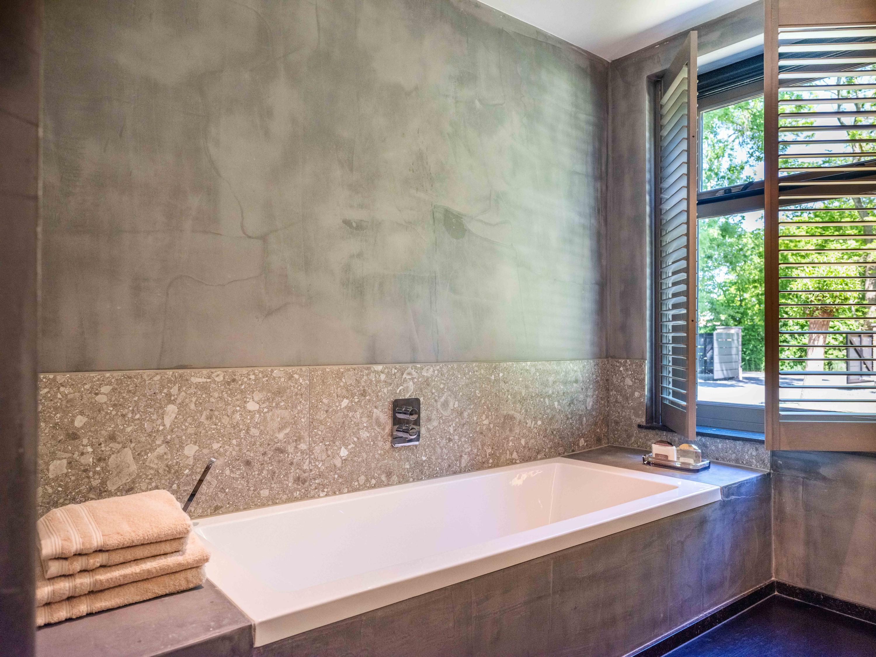 Also from the living room, there are passages to a separate toilet, several storage rooms and the master bedroom in the adjacent wing. This bedroom has a spacious walk-in wardrobe and an open bathroom with double sinks. The bathroom has a spacious shower with seat and a toilet. The view from both the bedroom and the bathroom faces the pool, further emphasising the luxury of the property and creating a wellness experience.
