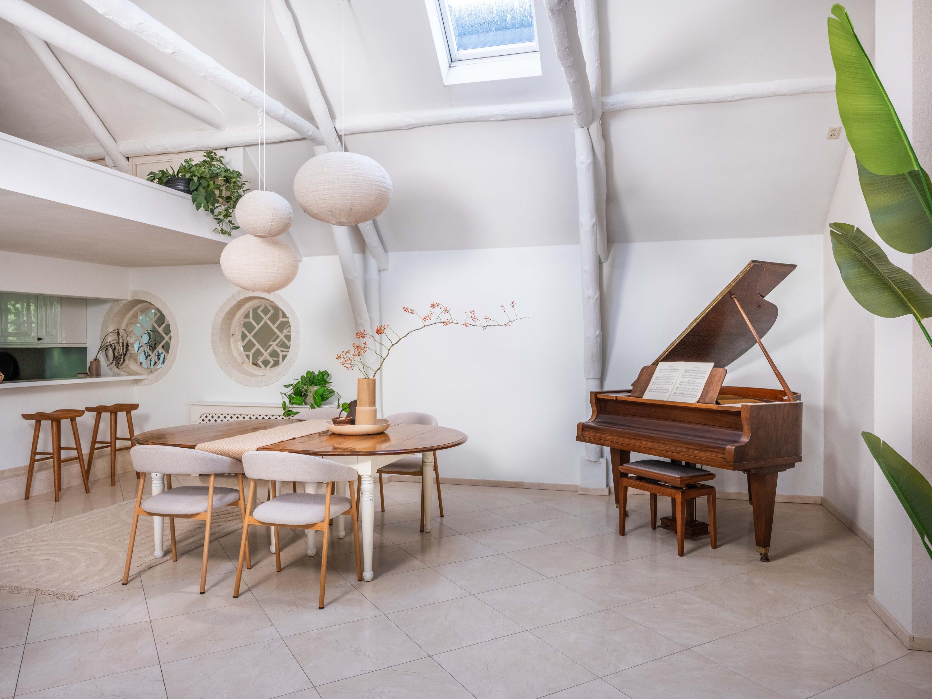 The spacious living room has a cozy gas fireplace (formerly fireplace) in the center of the room. The room is cozy with many authentic details. Think of the wooden beams in sight, a high ceiling up to the ridge and round stained-glass windows. At the back left we find the open kitchen with built-in appliances. From the kitchen we enter the utility room with the connection for the washer and dryer, the central heating system and a door to the outside.