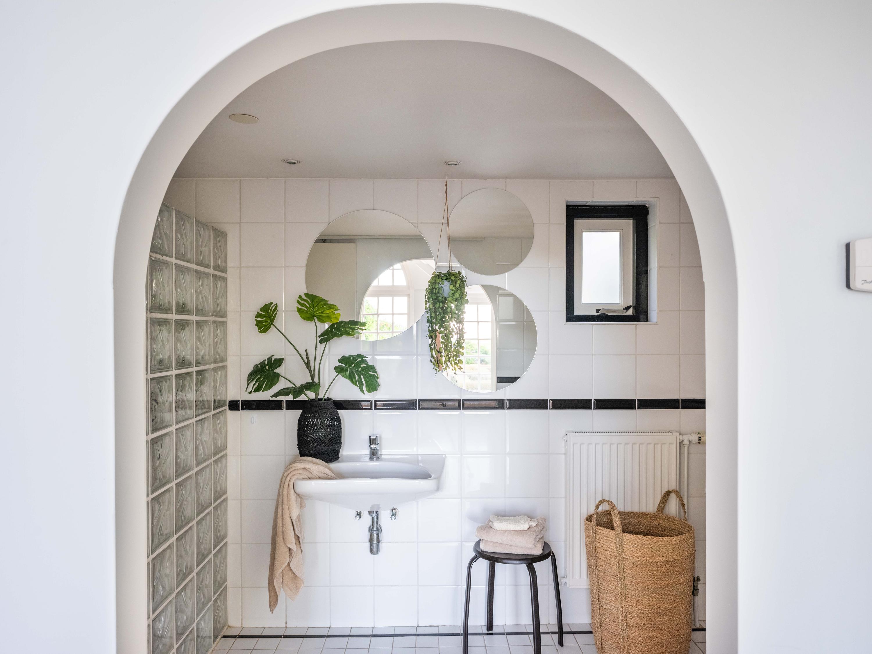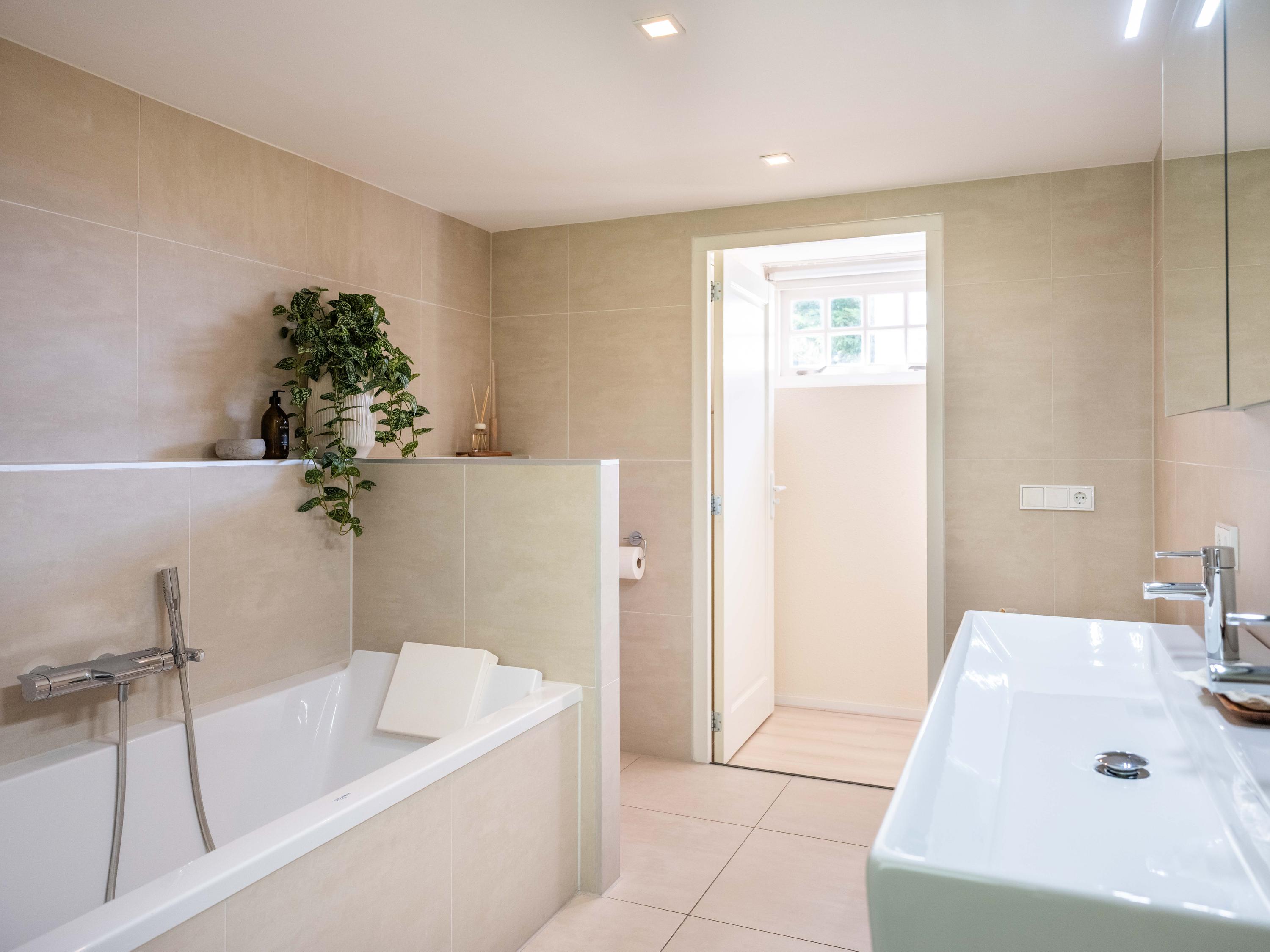 The deep front garden, brings us to the entrance of the house. Upon entering we enter the hall with immediately to the left a bedroom with private bathroom (ground floor living is thus possible here). The bathroom is equipped with a walk-in shower, sink, toilet and urinal. Back in the hall we find behind a wall a room that is now used as an office/guest room. Here is also located the toilet and an additional shower stall.