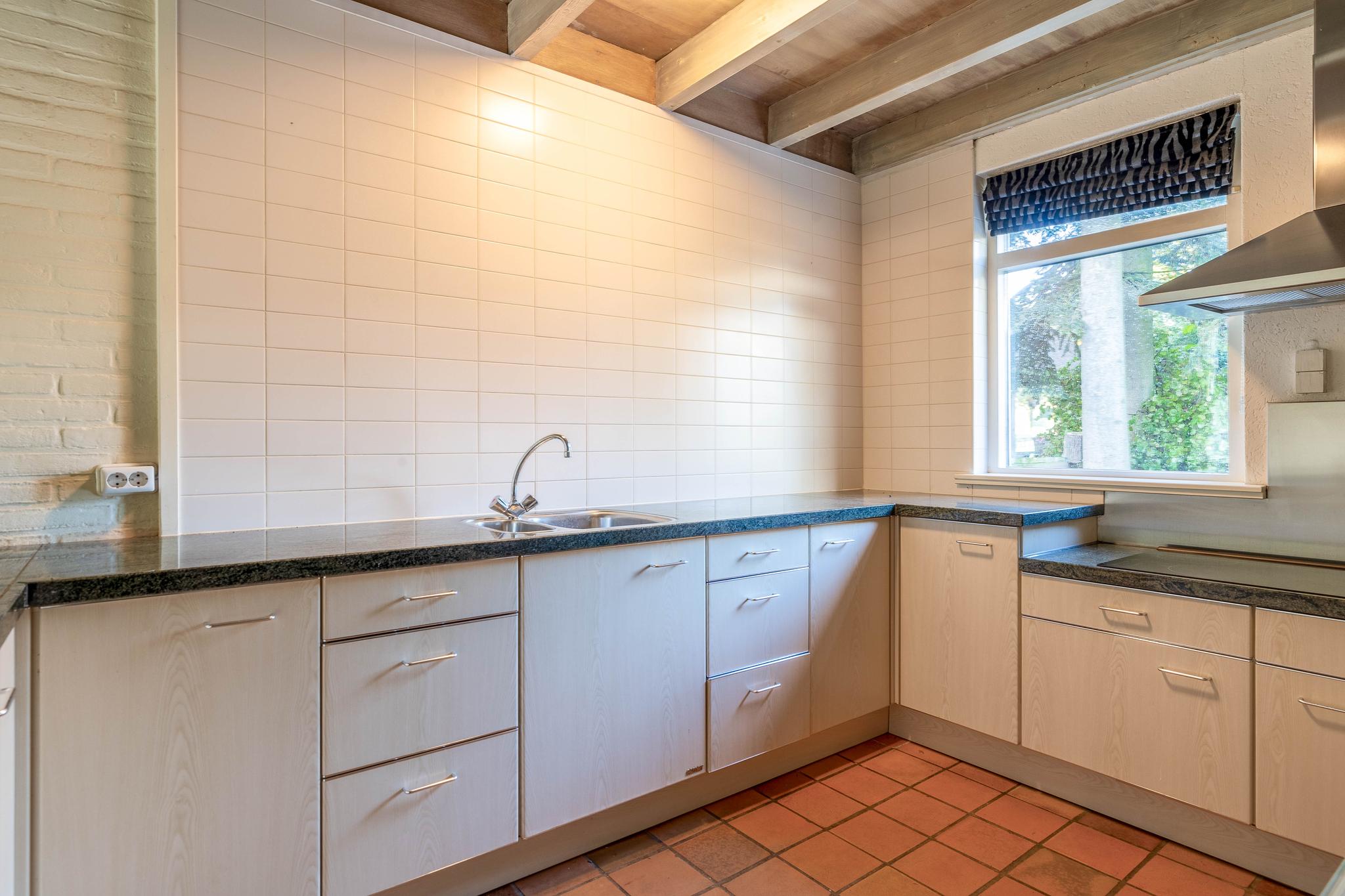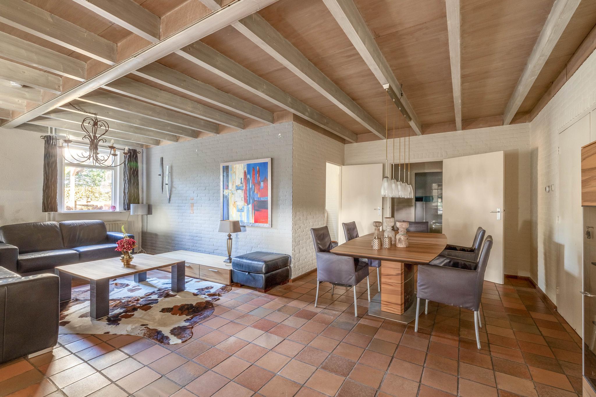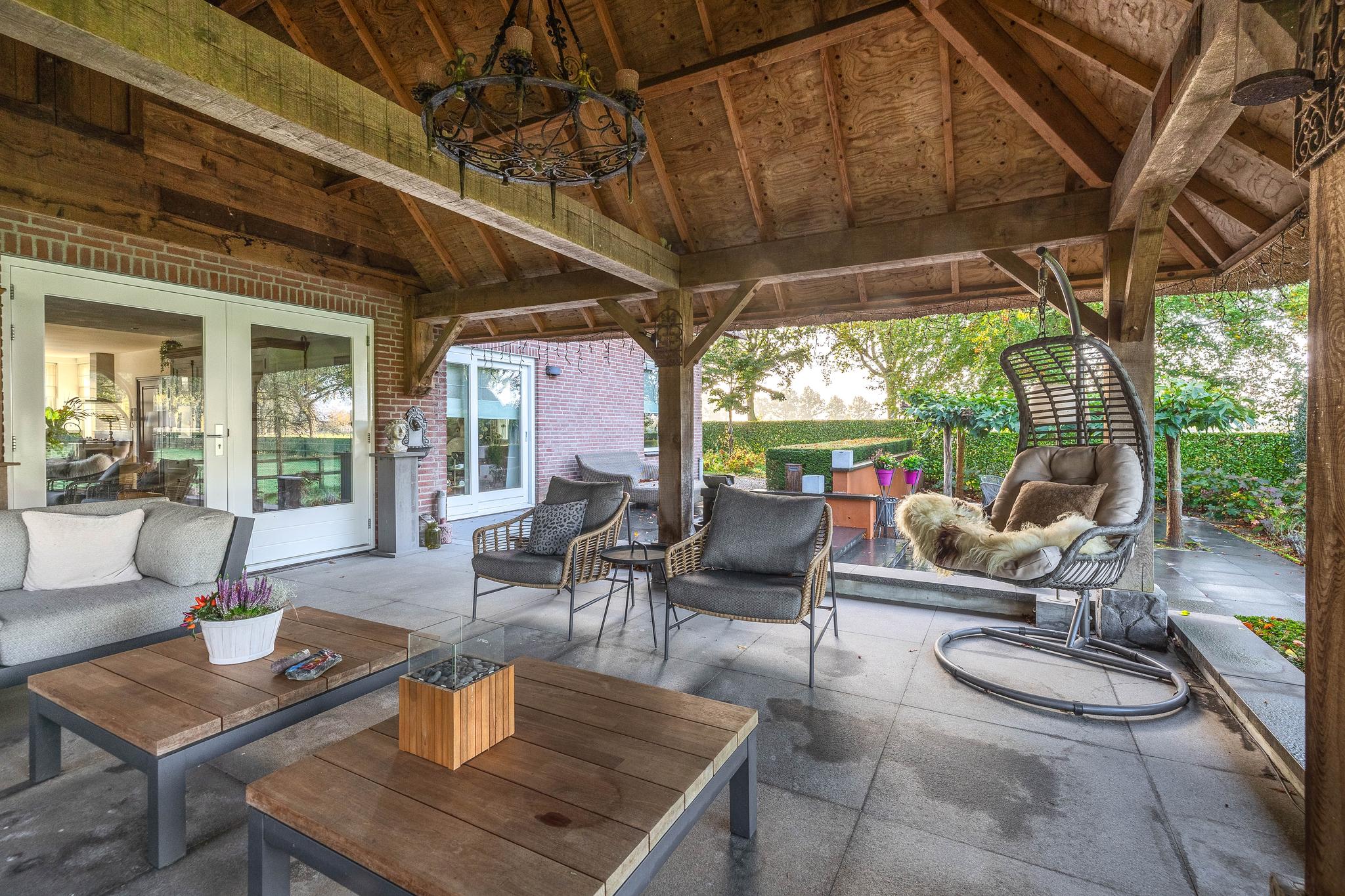 The garden surrounding the house is beautifully landscaped and well maintained. The garden is laid out with borders with perennials, trees, lawn and several terraces. At the front is a terrace, at the rear the terrace has a very beautiful and attractive canopy. This canopy is made of oak and has a glass wall. The roof is covered with reeds. The terrace offers beautiful views of the meadows. In short, a lovely place to be! A little further on is an aviary and another covered terrace. From here, too, there is a beautiful view of the meadows.