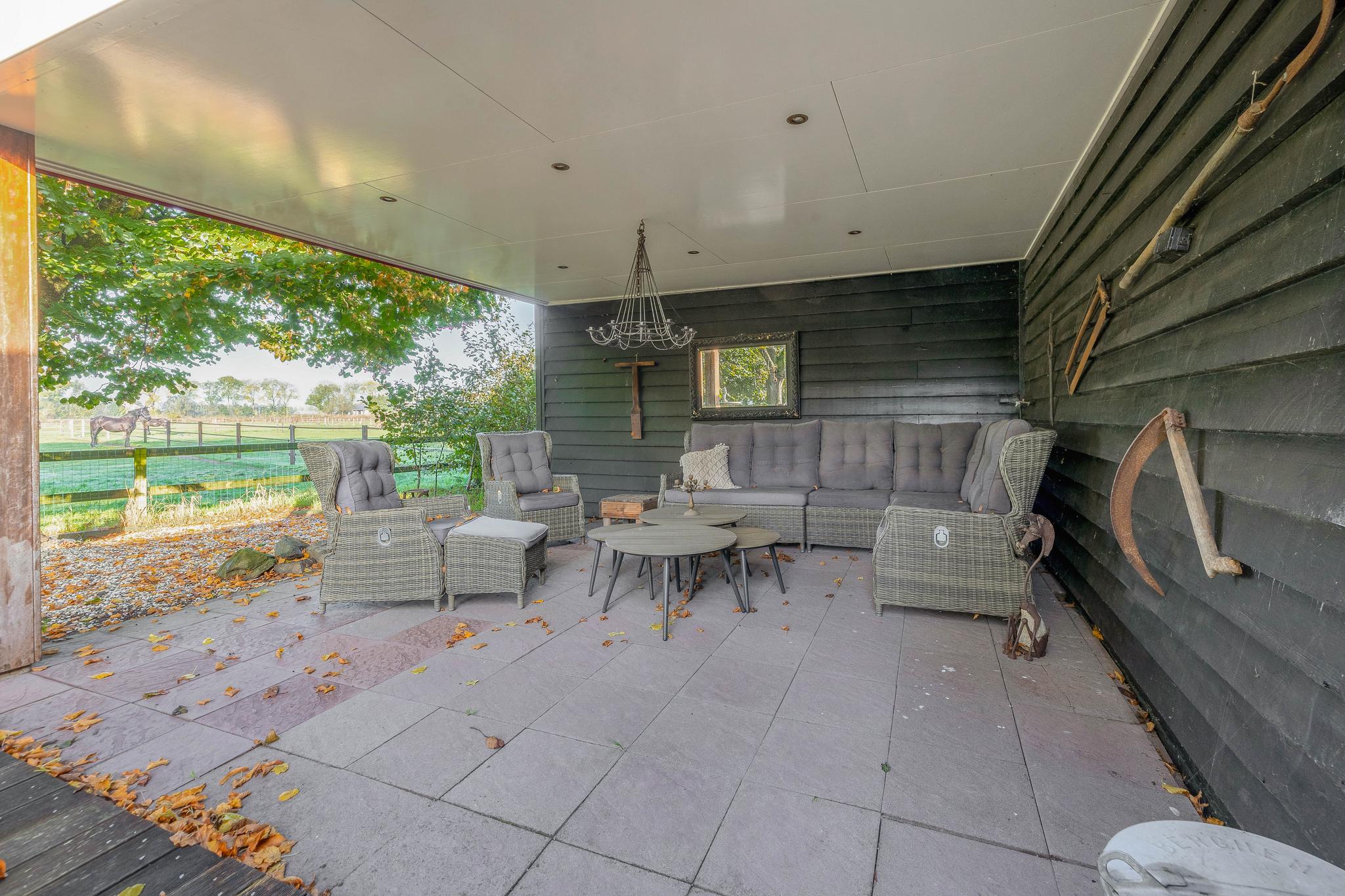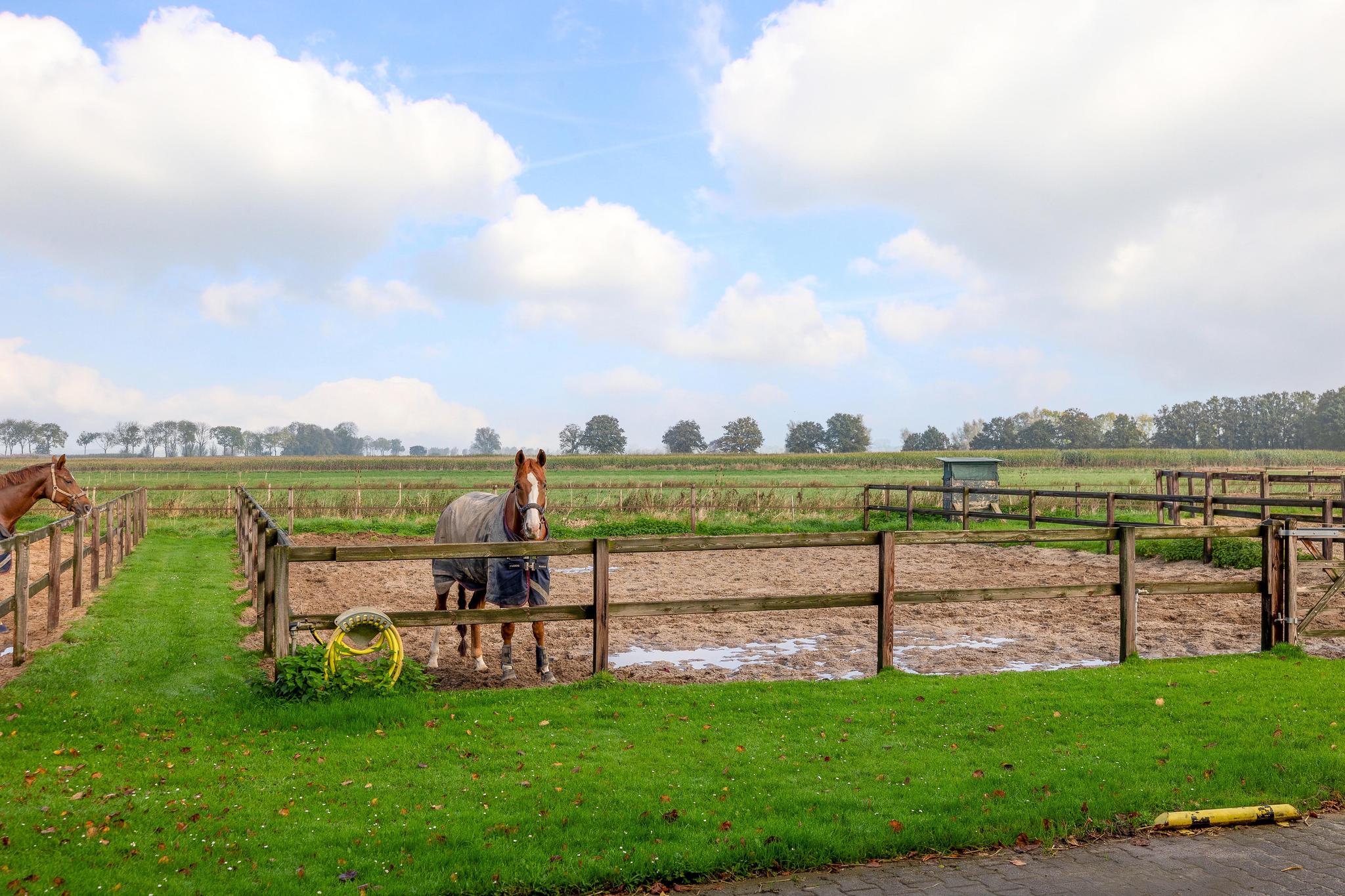 The yard is further equipped with an outdoor arena, covered horse walker, a lunging circle, several paddocks, a storage/field barn, shed, manure heap, pasture and a detached shed. There is ample parking space for stabling trailers and trucks, among other things. The yard can be closed with an electric opening gate. The storage/field shed with open front is constructed of partly masonry / partly sheet piling with wooden rafters and a sheet piling roof.