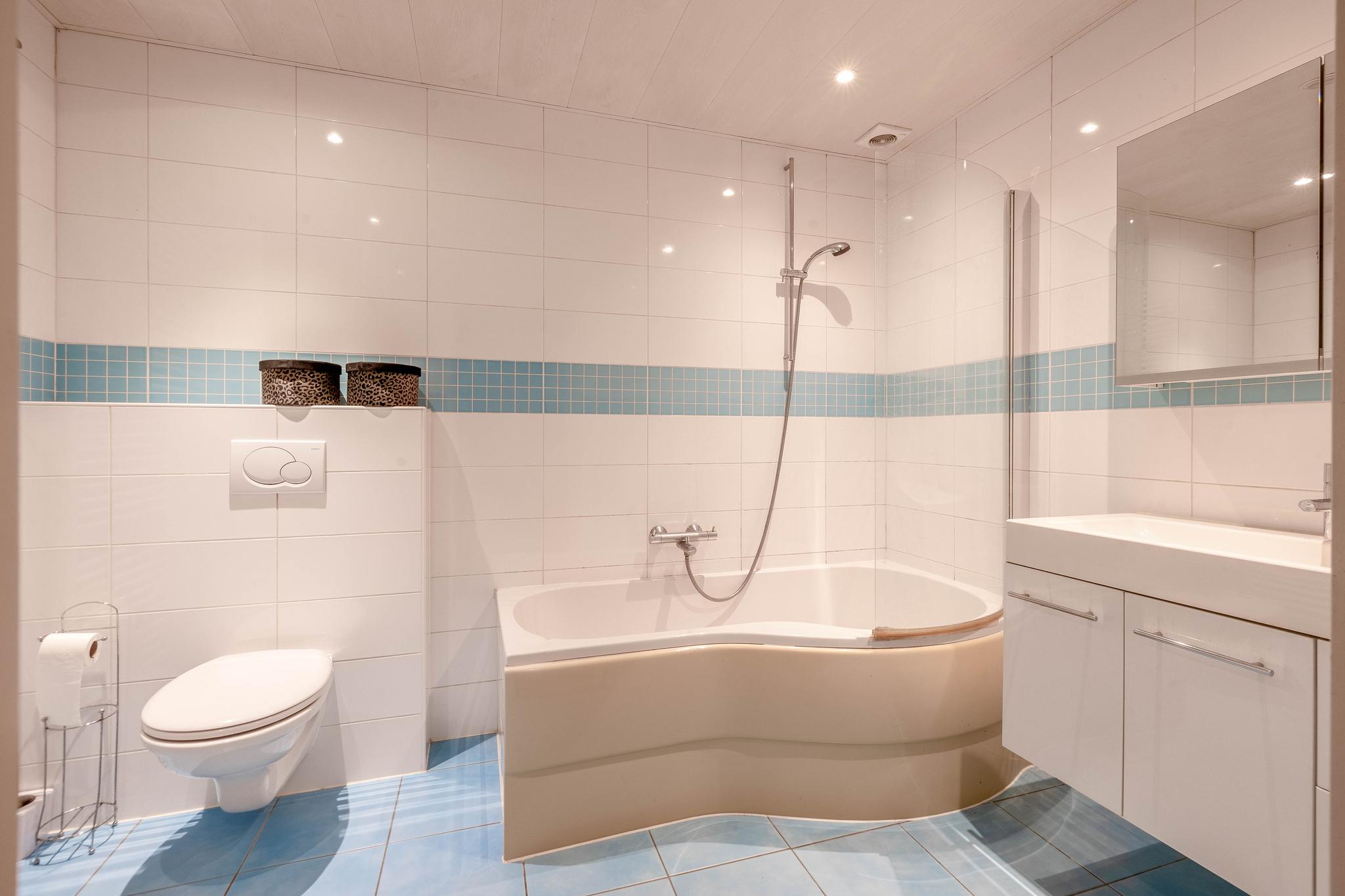 The hall provides access to the living room, meter cupboard and via a fixed staircase there is access to the 1st floor. The hall has a PVC floor in herringbone pattern, partly masonry/ partly stucco walls and a stucco ceiling. The hall provides access to the living room, meter cupboard and via a fixed staircase there is access to the 1st floor. The spacious living kitchen is also equipped with the same PVC floor in herringbone pattern. The walls and ceiling have been plastered. The kitchen layout is in a U-shape with a storage island. The kitchen is further equipped with a dishwasher, combination microwave oven, sink, 5-burner gas hob and fridge. From the kitchen, there is access to the cellar. The cellar is fully tiled and equipped with a cuckoo and a window. There are fixed shelves and a wooden staircase. A hatch provides access to the space under the house. The practical utility room is partly tiled and the floor is covered with a tiled floor which has underfloor heating. Practical sliding cupboards provide storage space. This is where the central heating combi boiler, the underfloor heating unit and the connections for the washing equipment are located. From the utility room, there is access to the toilet room and the yard. The toilet room is fully tiled and further equipped with a hand basin and a floating toilet.
