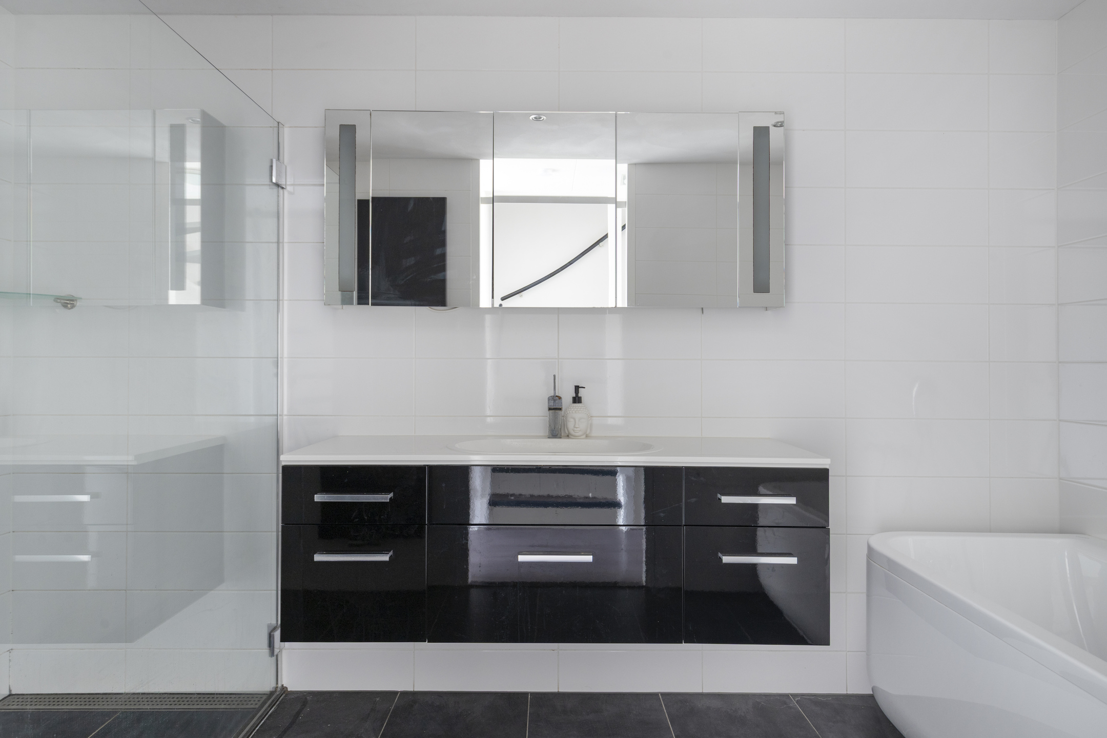 The modern bathroom is fitted with a bathtub, washbasin with vanity unit, separate shower, underfloor heating and a design radiator.