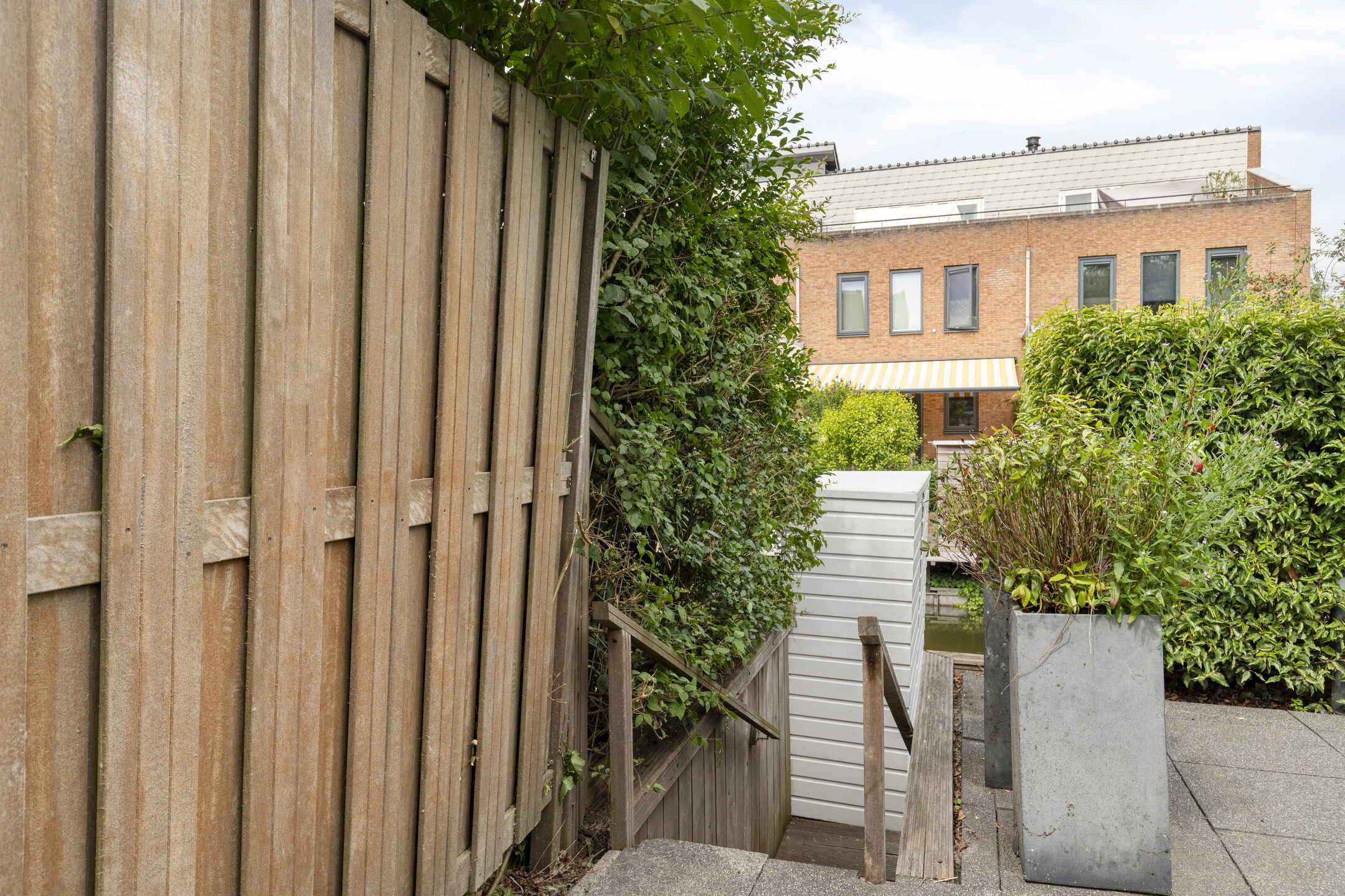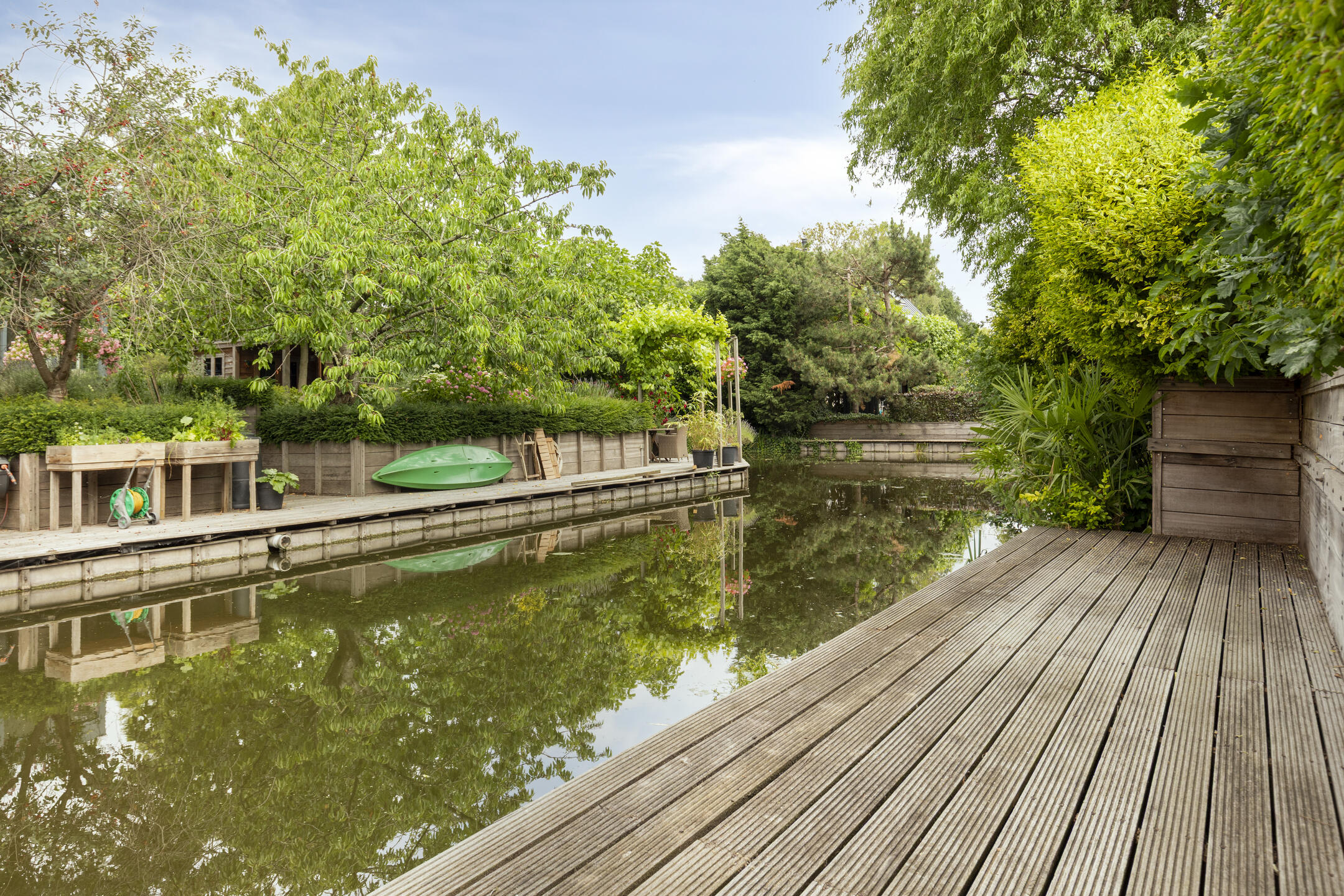 The property features a garage, private parking for three cars and a sunny west-facing backyard next to a charming waterway.