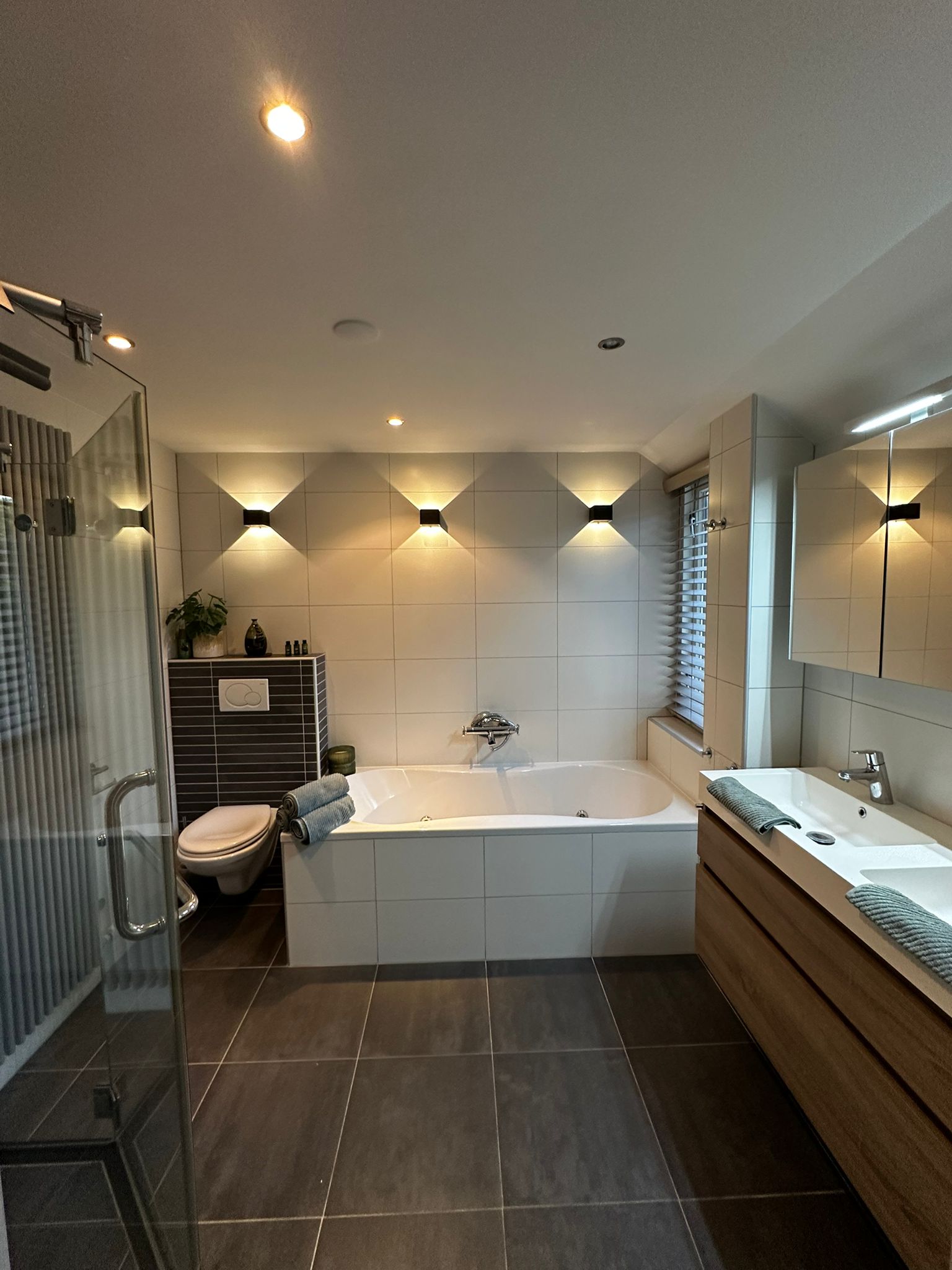 The bathroom includes a bathtub, toilet, shower, and double washbasin.
