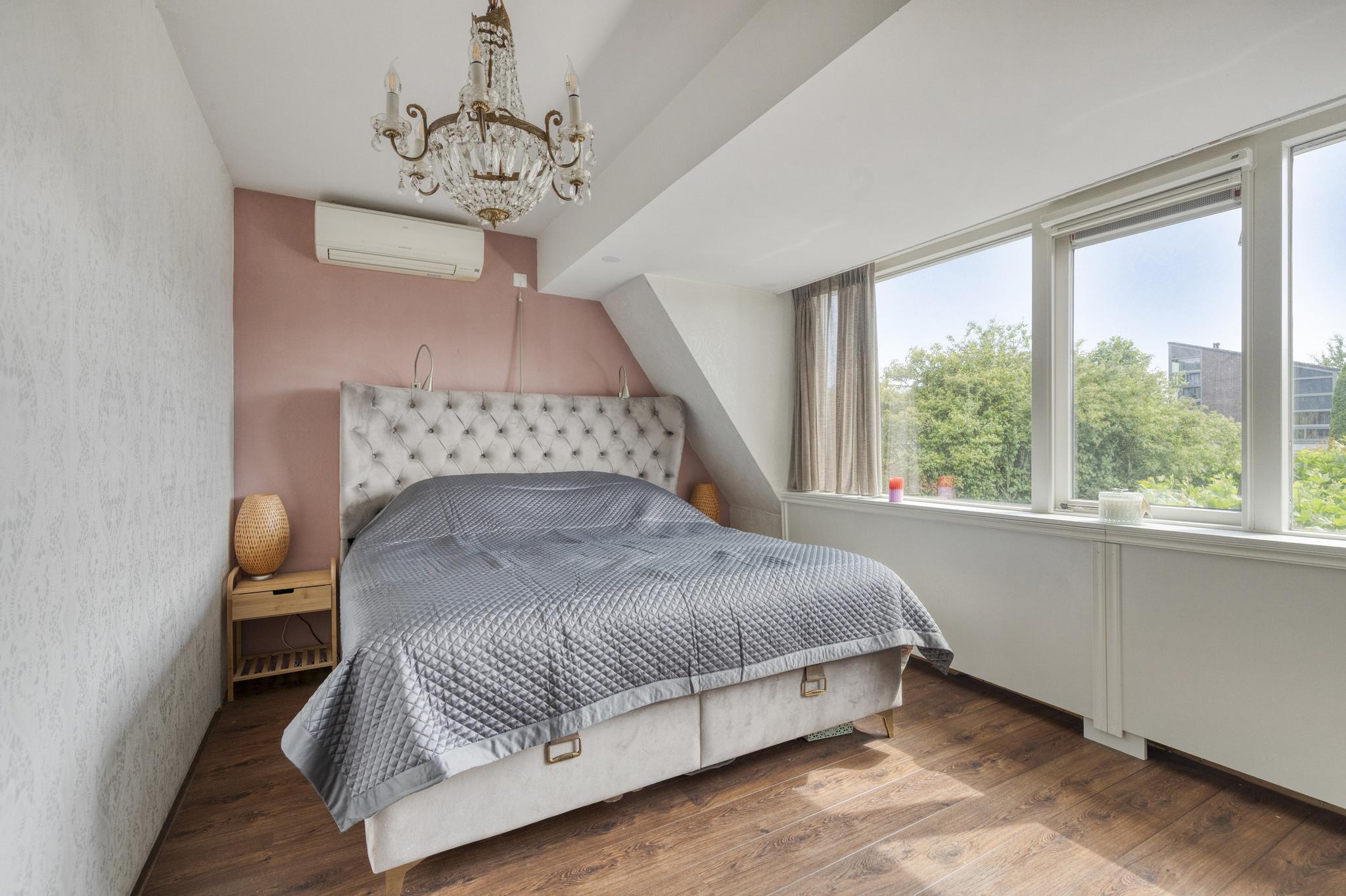 Rear bedroom with air conditioning and dormer window with electric shutters, plus a neat walk-in closet with window.