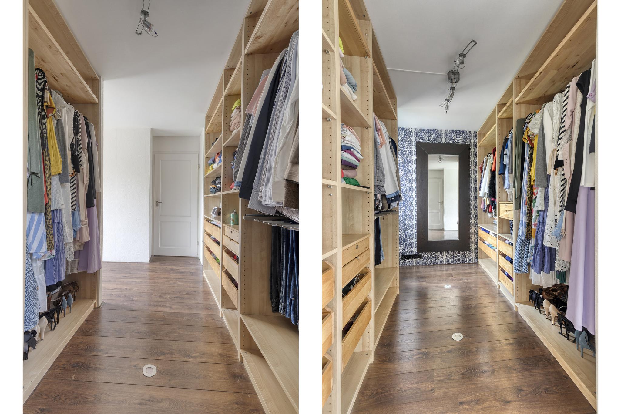 Bedroom with both a roof window and side window, plus a built-in wardrobe. Extra storage space can be found behind the knee walls under the sloped roof.