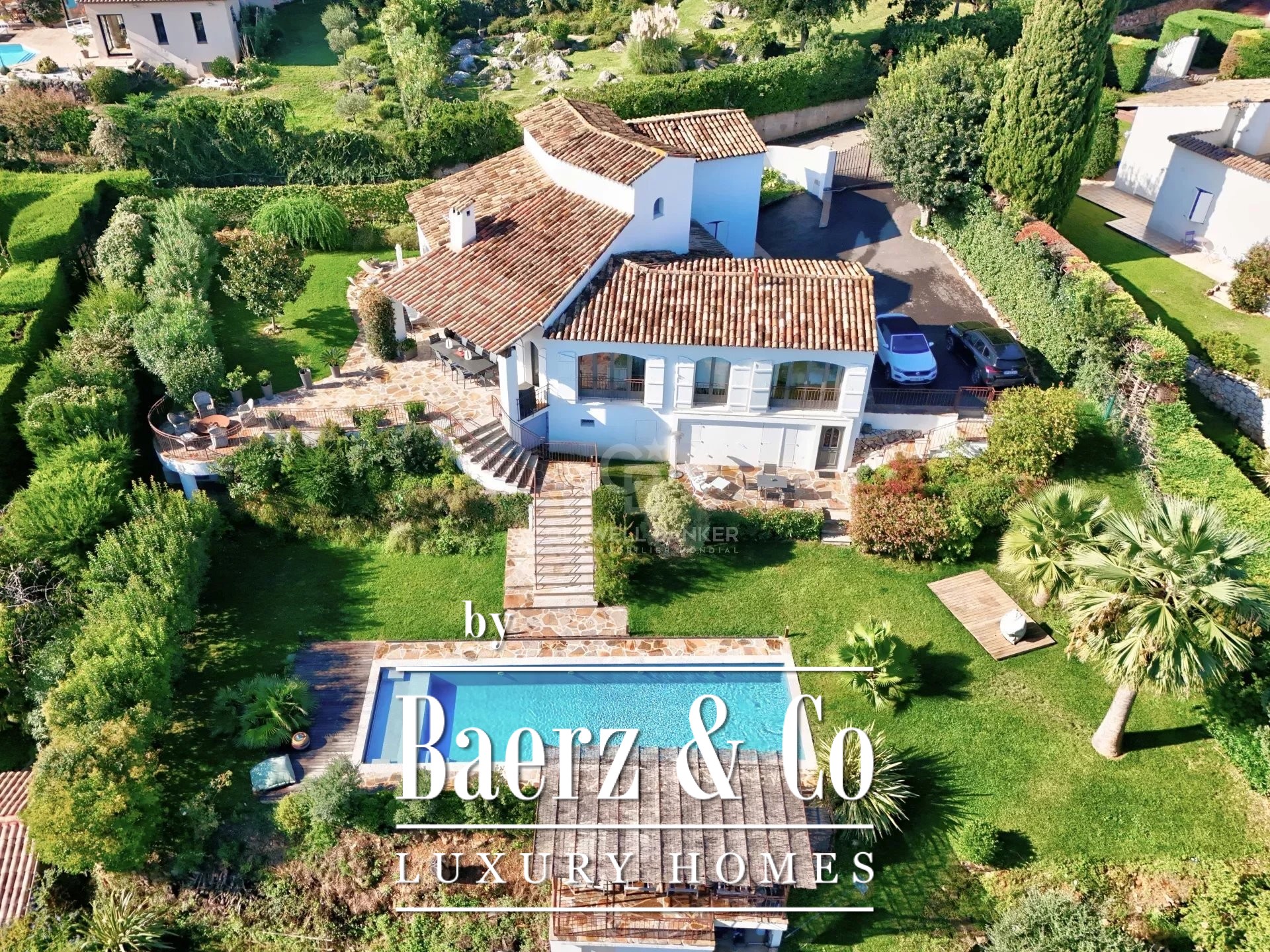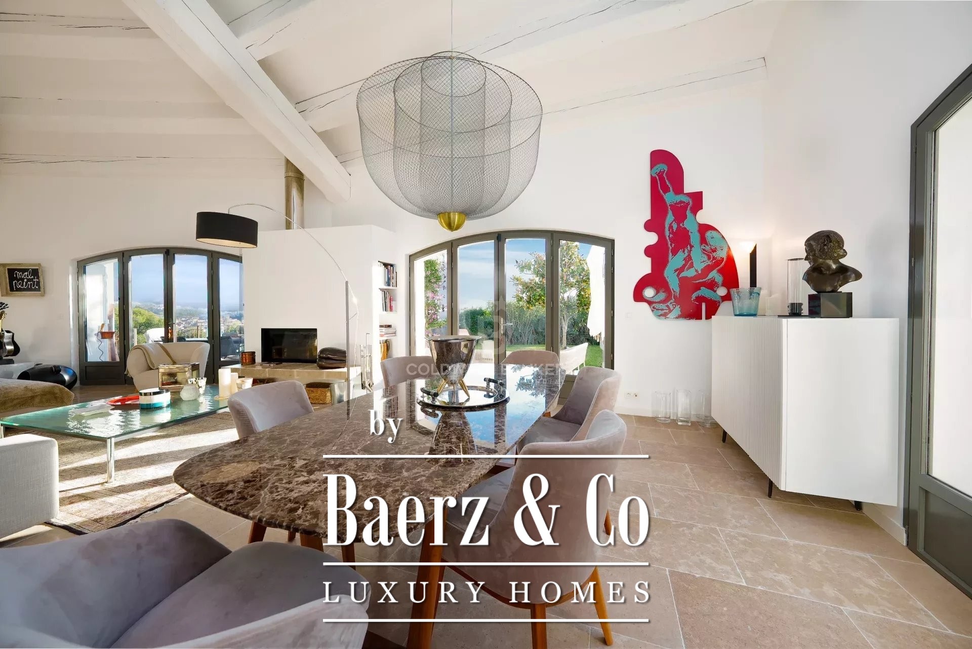 Located in Biot, gorgeous and renovated villa of 280 sqm in a perfect condition enjoying a panoramic view on the Sea, the village of Biot and the mountains. The house consists of an entrance, a spacious living room with heigh ceiling, fireplace and access to the terrace, tv area, a nice opened kitchen and a laundry. On the ground floor, you also enjoy a large master suite with complete bathroom