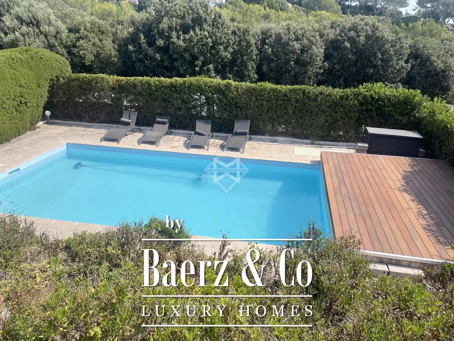 The villa unfolds over 2 levels, offering beautiful living spaces as well as an en suite bedroom on the first floor that opens directly onto the large terrace and pool area below. Upstairs, there are 4 further good-sized bedrooms, 2 of which have private balconies with sea views. There's also a sauna area and a garage! A second garage can be purchased separately.