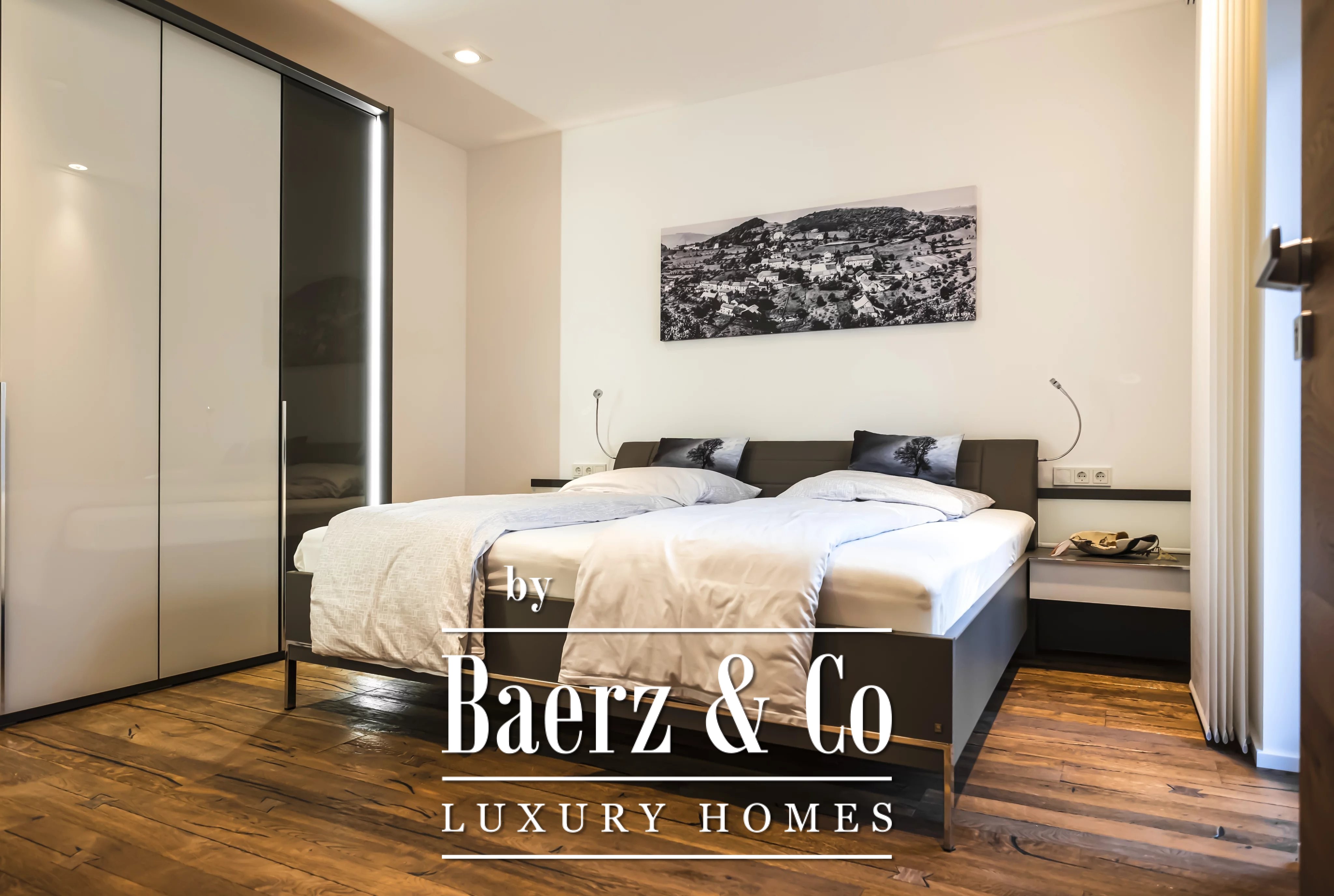 Interior appointments emphasise both comfort and precision. The residence is fully furnished and fitted with top-tier appliances including a refrigerator, dishwasher, oven, and microwave. Details such as triple glazing, a connected thermostat, electric blinds, and advanced home automation contribute to the home’s quiet efficiency. Air conditioning and dual-flow ventilation maintain a regulated climate, while the presence of fiber optic internet and a videophone system add modern convenience.