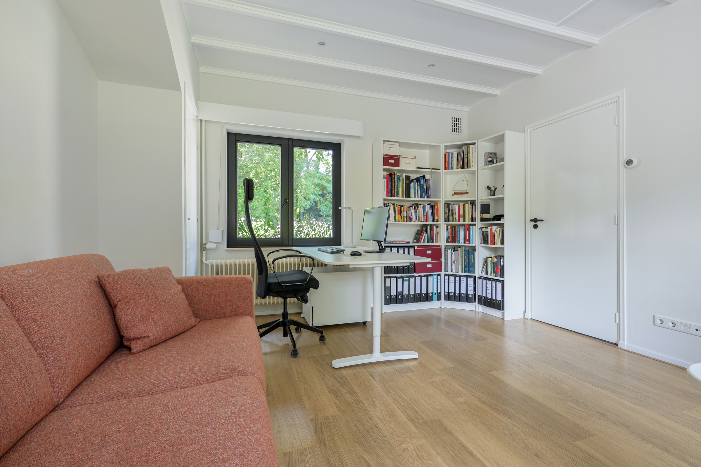 You enter the house through the spacious entrance, which features a slate tile floor. In the hall, you will find the meter cupboard (16 groups + 2 residual current circuit breakers and provisions for an electric car) and the wardrobe.