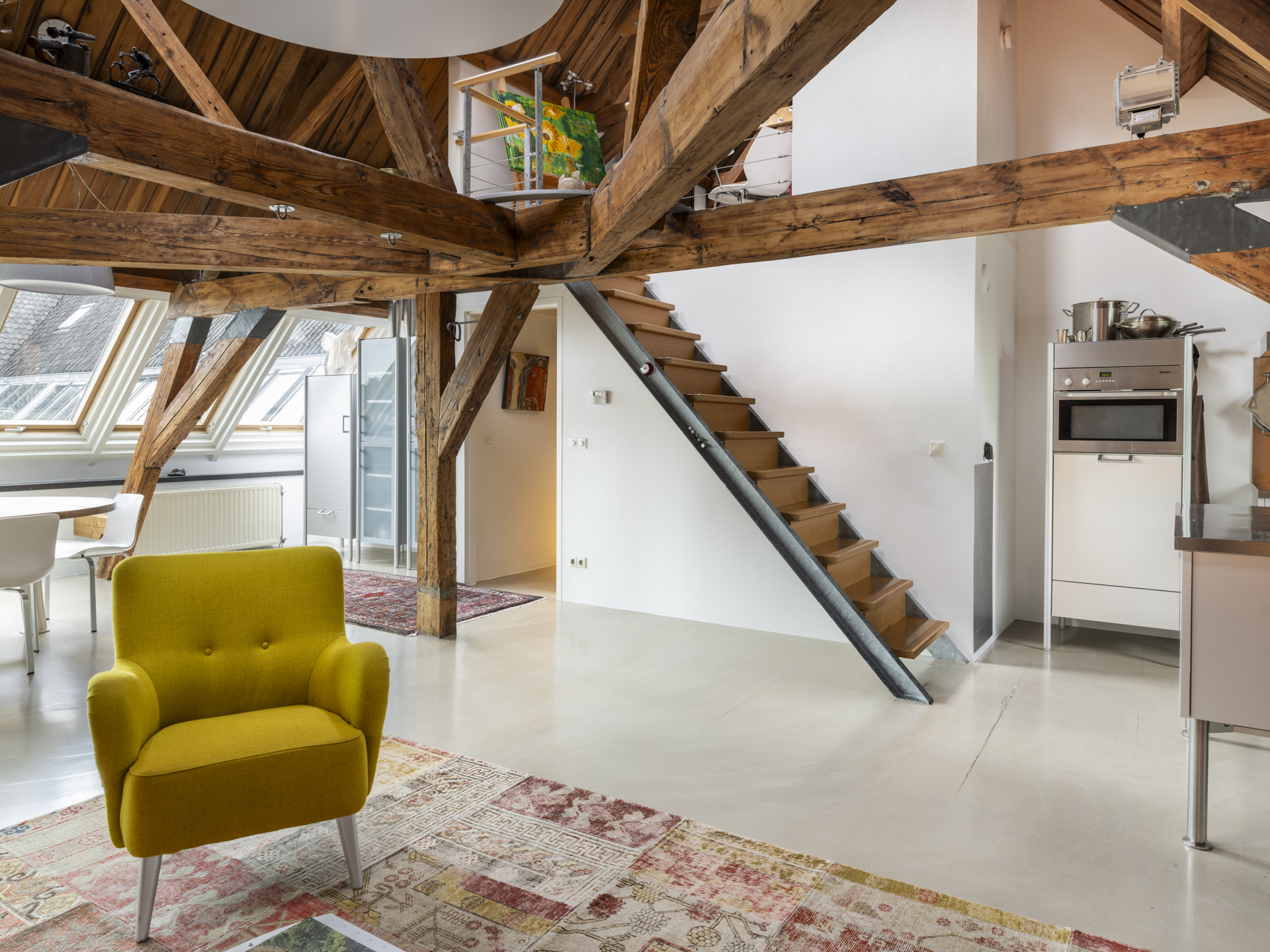 This fantastic loft apartment is located on the top floor of the monumental building complex 'Justinus van Nassau'. 'Justinus van Nassau' has a rich history dating back to around 1560. Around the year 2000, this beautiful historical building was transformed into a unique residential complex in the heart of the city. This apartment has a unique character due to its location under the monumental roof. The atmosphere is unparalleled; a spacious effect is achieved through the 'open' layout and the high monumental roof structure, which remains visible throughout the apartment.