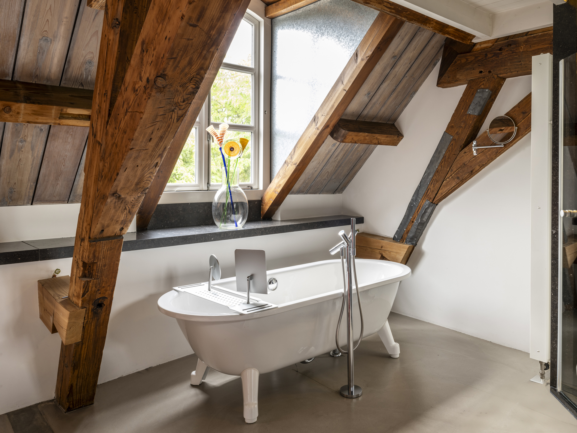 The bedroom and bathroom are located on the other side of the aforementioned hallway. The spacious sleeping area (approx. 55 m² in total) is situated on the side of Kasteelplein. Even in the bedroom, you have a full view of the preserved monumental roof. This room also includes two very large walk-in closets.