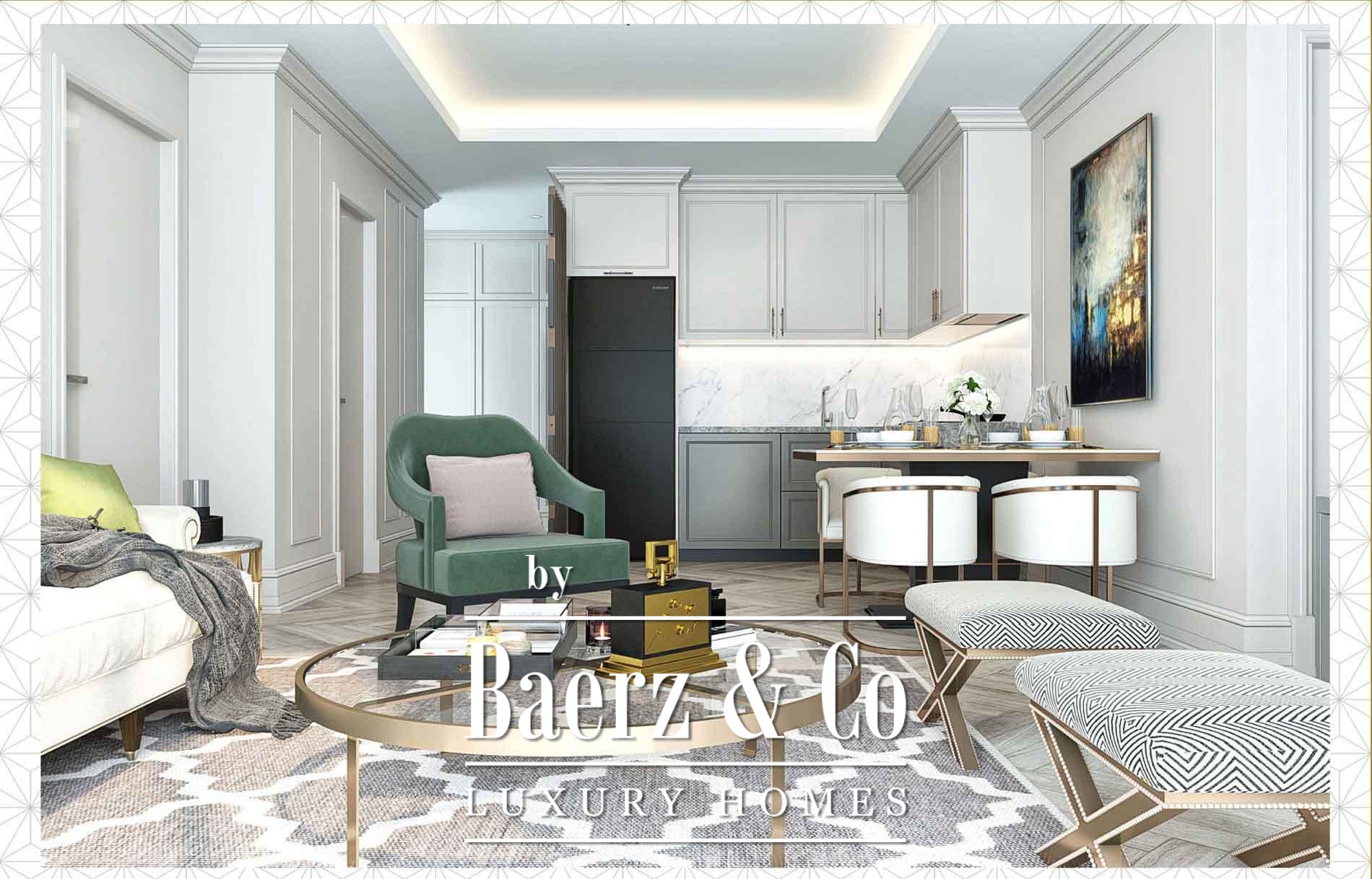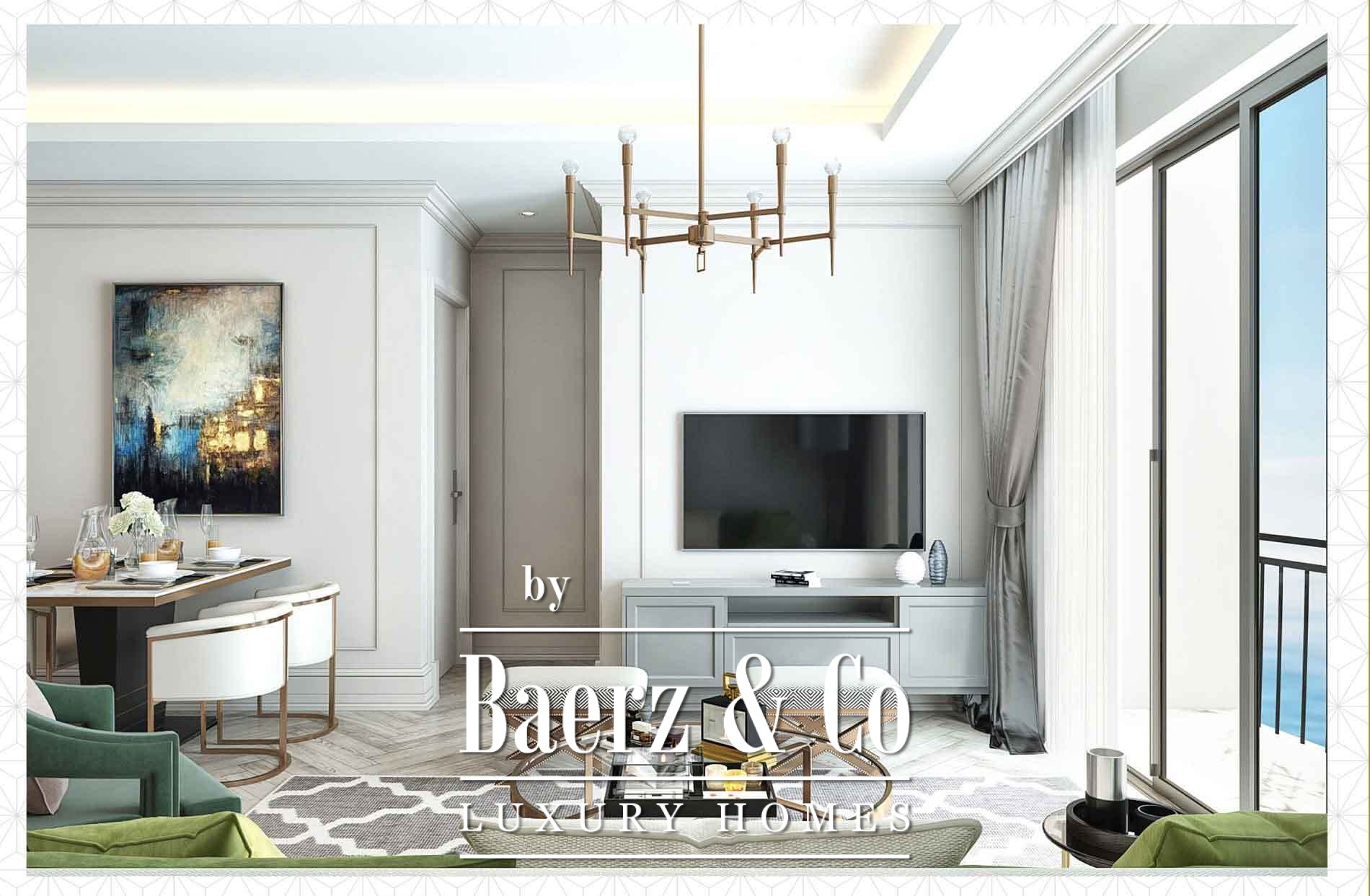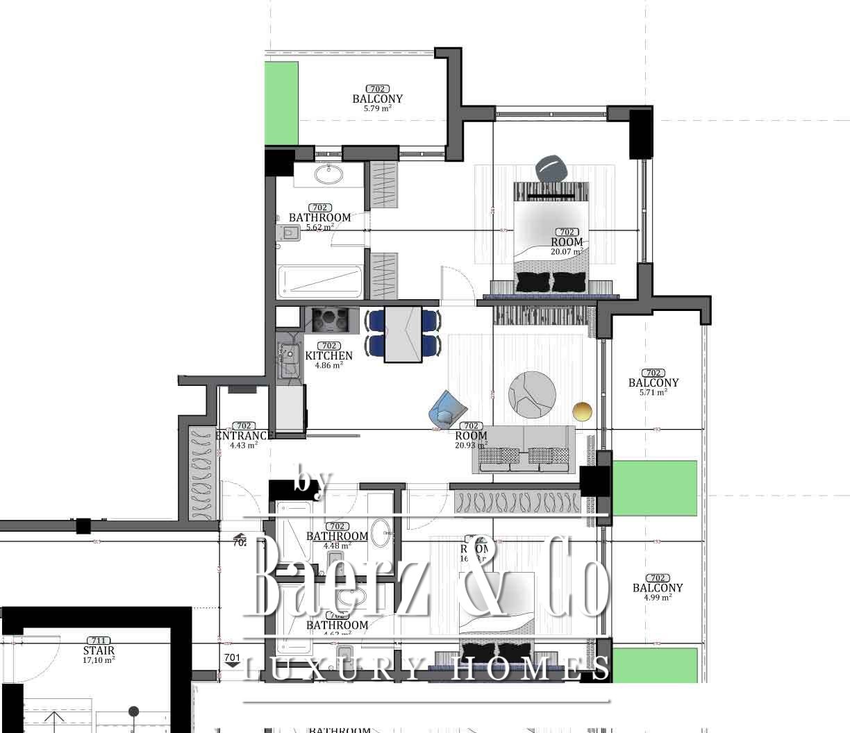 Structure of the apartment: hallway, living room with kitchen and dining table, a bedroom, 2 bathrooms and a terrace. The apartment itself has 79,76m2, while its 3 terraces have 16,49m2. It has a sea view and the view of mountains. It will be delivered with finished floors, finished tiles, equipped bathroom and equipped air conditioning.