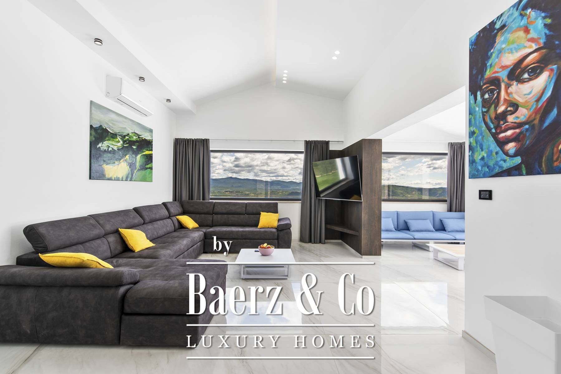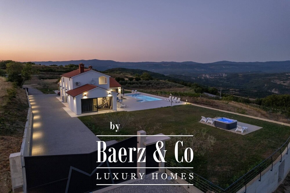 Outdoors, a large swimming pool, jacuzzi, and summer kitchen are positioned on the lower part of the property, ensuring uninterrupted views at any time of day. Underfloor heating via a heat pump provides comfort through both levels, complemented by six air conditioners for both heating and cooling. This villa is equally suited to those seeking a secluded residence or a strategic investment in Istria’s serene landscape.