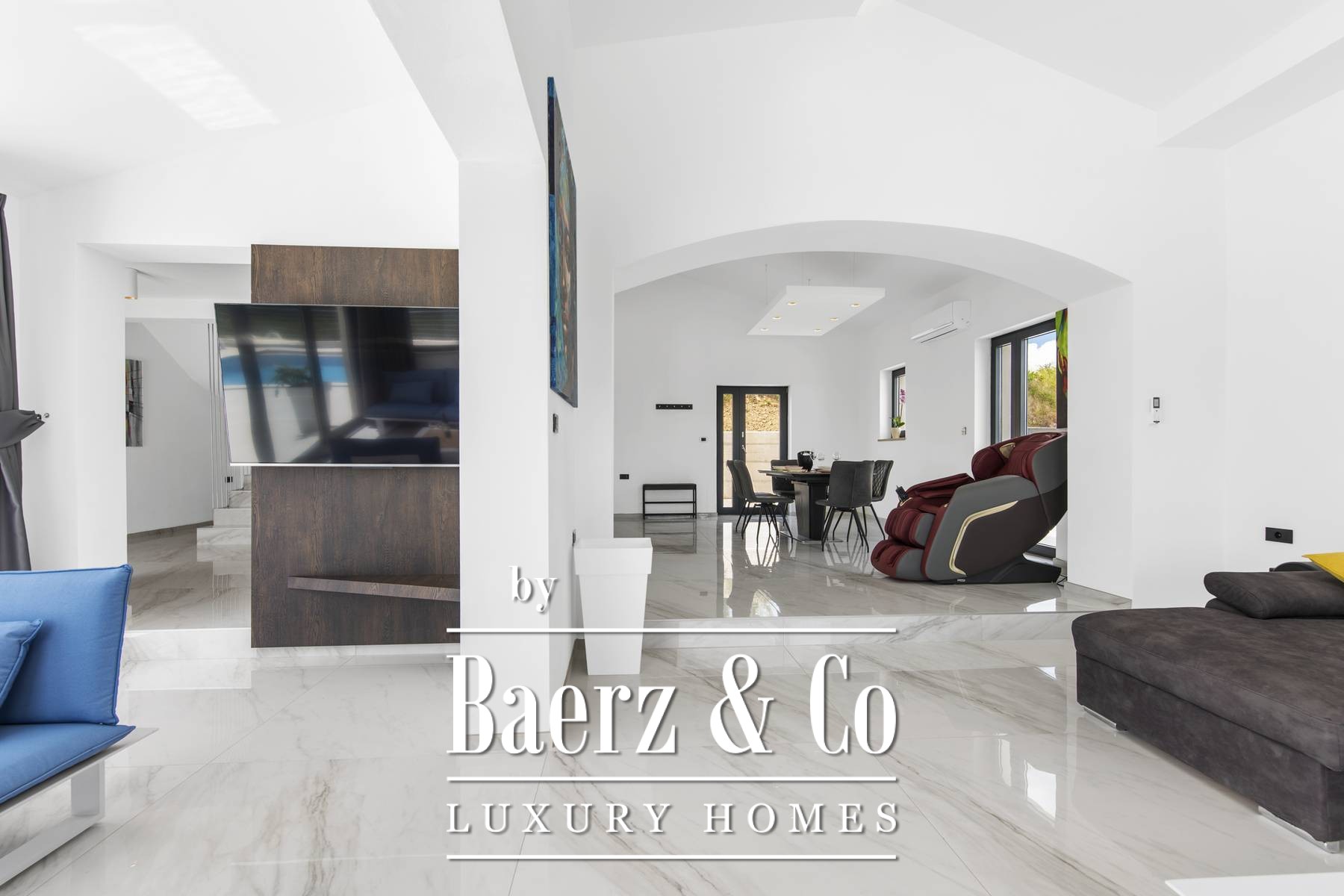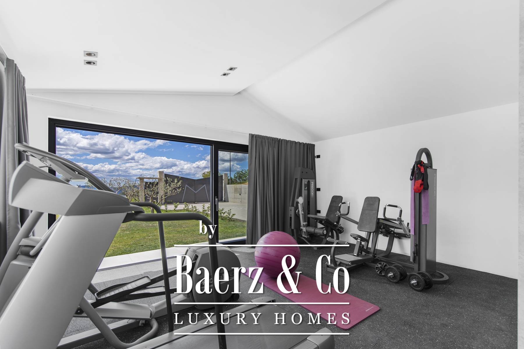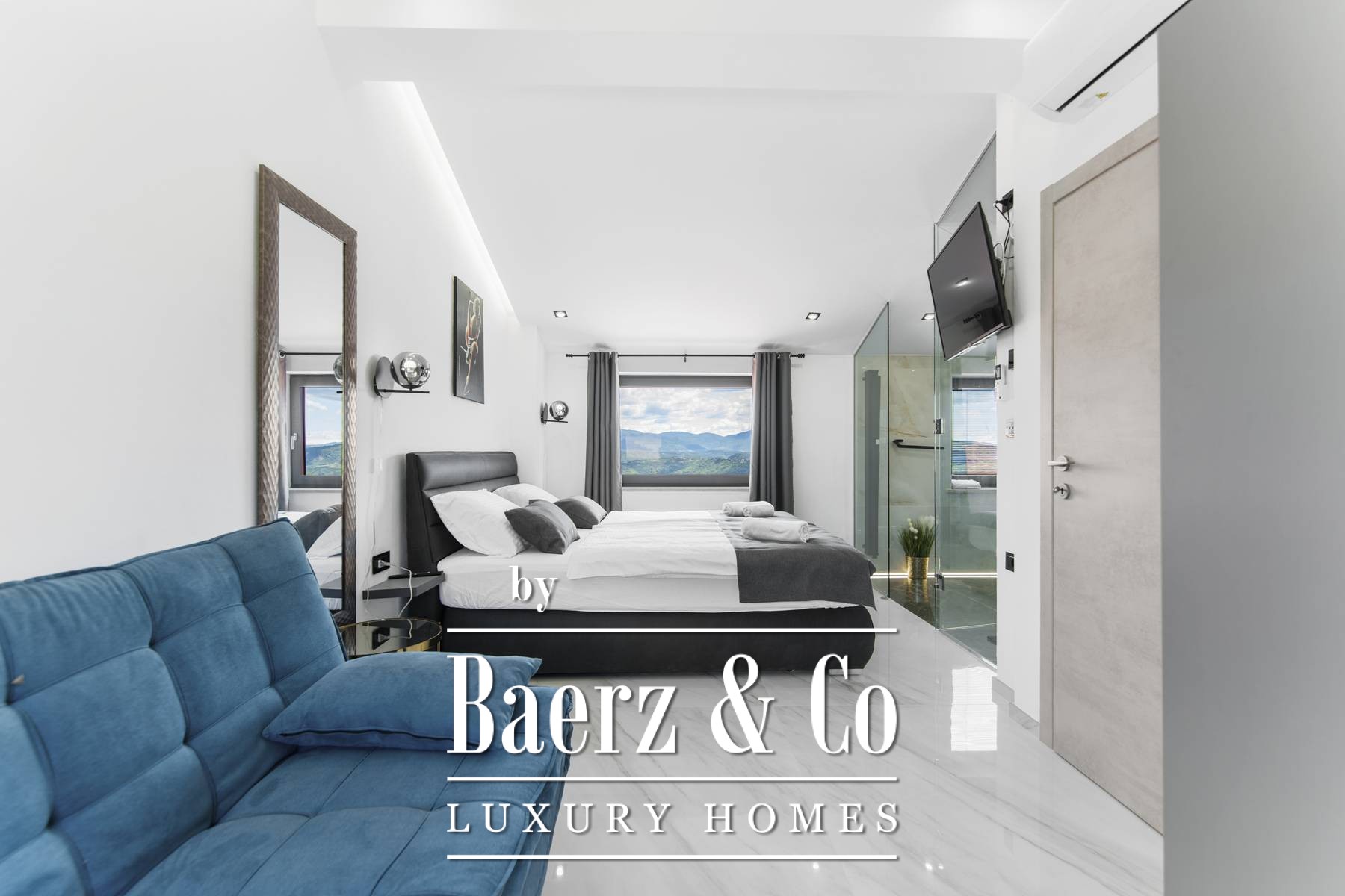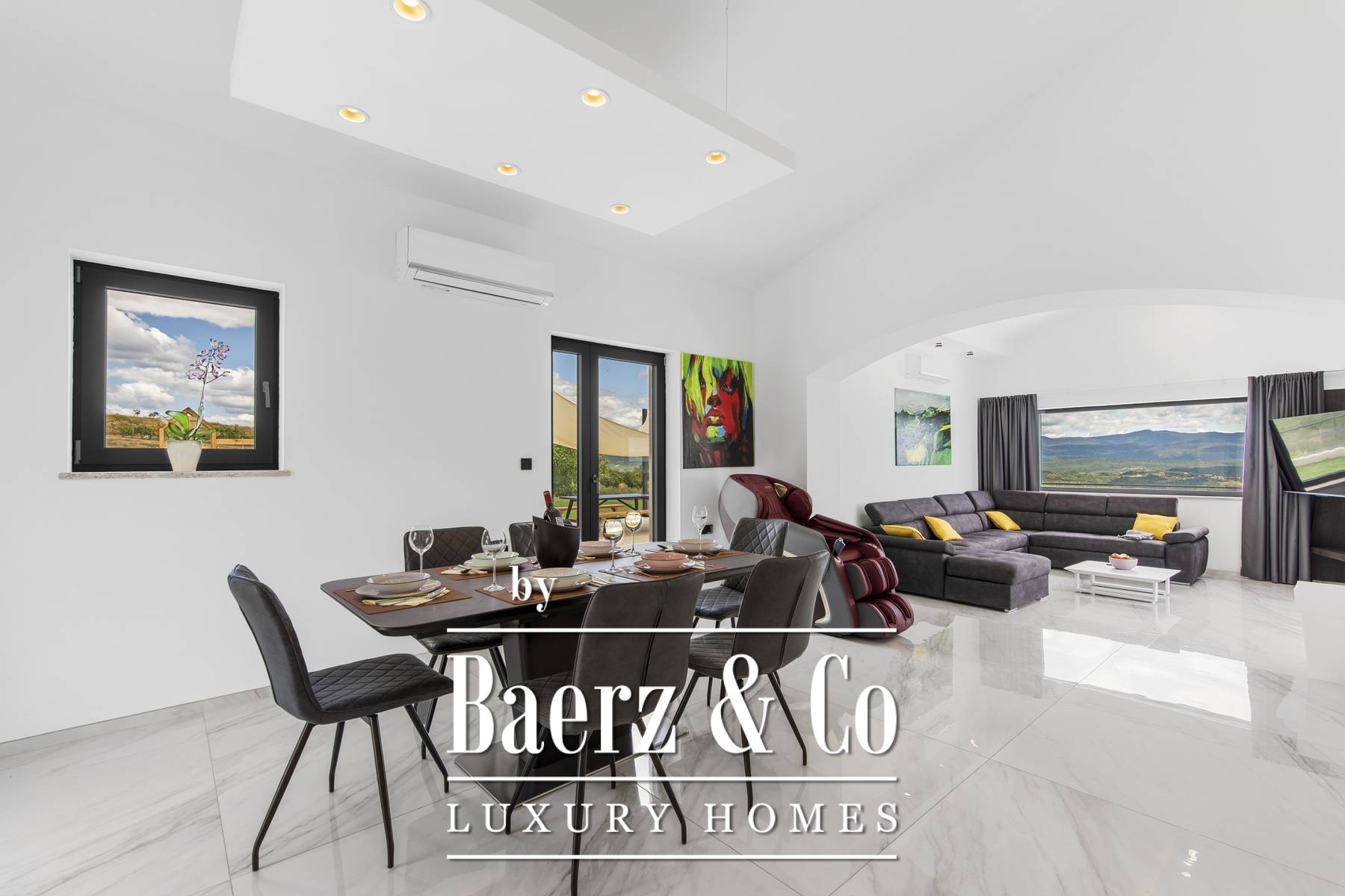 Every room of the villa is designed to embrace the panoramic vistas, with expansive glass walls welcoming light and framing the beauty of rural Croatia. The main floor’s open concept connects living, dining, and kitchen, complemented by a bedroom, bathroom, and a fully equipped gym. Upstairs, two further bedrooms each feature en-suite bathrooms and access to a terrace.
