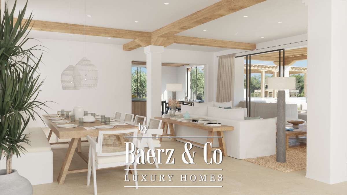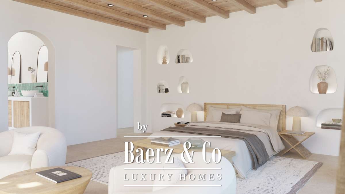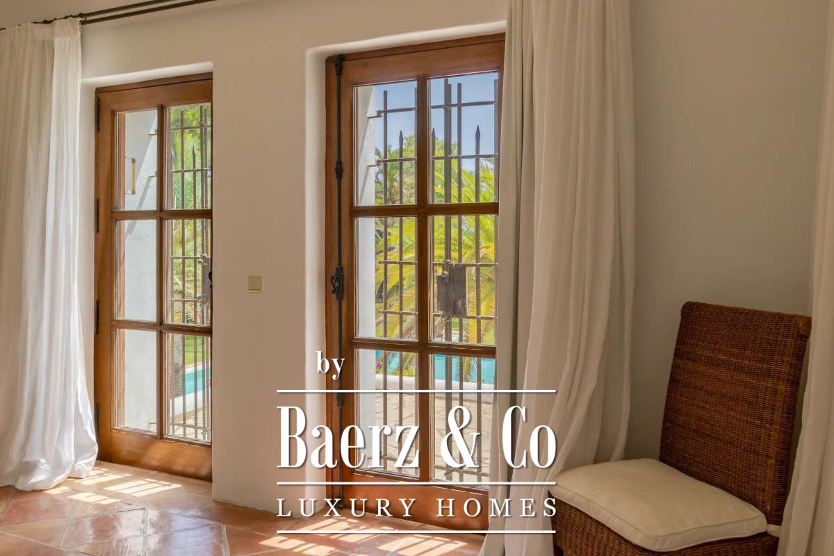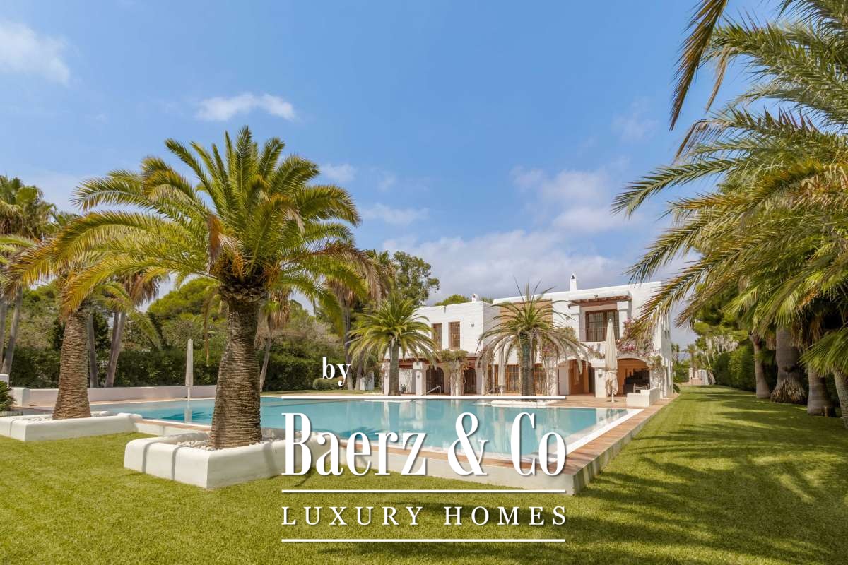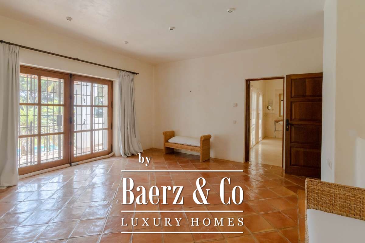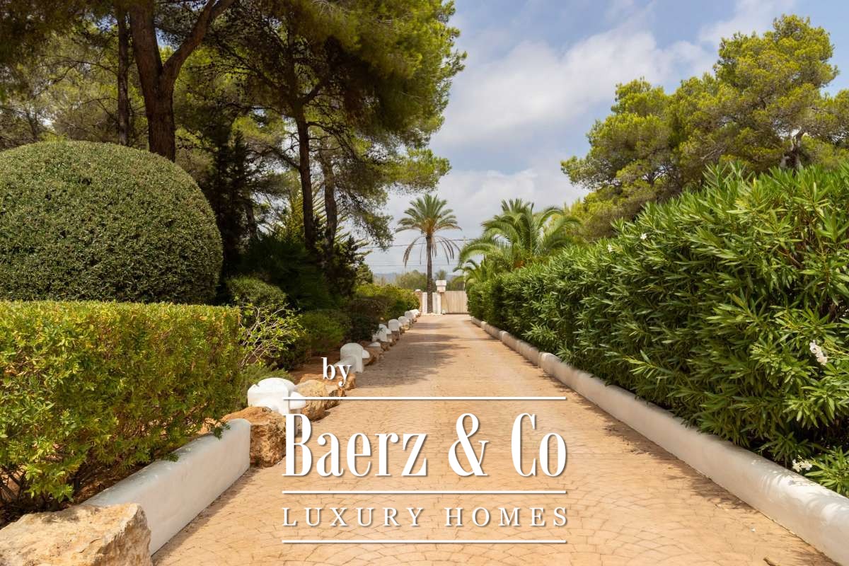 in the background. It also comes with a large ensuite bathroom. The other bedrooms also have their own balconies with the spectacular garden views, making it a dream to wake up in your own private paradise. The house also comes with air conditioning and heating to keep room temperatures comfortable in any season. Noteworthy, the main characteristics of this magnificent property will be maintained, but renovated with a beautifully new interior design project from Blakstad.The outdoor spacesThe centerpiece of this lush and tropical garden is the remarkable 246m2 large swimming pool. Take a refreshing dip in one of Ibiza’s most beautiful pools, and enjoy a private retreat in your own serene oasis. This garden is also ideal for entertaining and hosting guests with its many convivial and shaded terrace areas, decorated with its pink flowers. Be captivated by the magnificent sea views looking through the surrounding palm trees and the lush greenery, also providing extra privacy. On top of that, there is also a small pathway at the back of the garden, bringing you closer to the ocean in just a few steps. In addition, the front garden offers a large piece of land for agriculture. Entering the property, you will find an automatic gate with a luxurious two-lane driveway, where you can comfortably drive in and park your car in the shaded parking space at the end of the roundabout. There is ample space for more cars to park, making it very convenient and secure when receiving guests or family. Embrace the Ibizencan lifestyle and enjoy the perfect blend of a traditional modern design with exquisite amenities in this majestic villa.