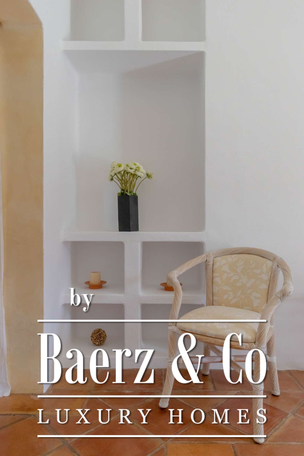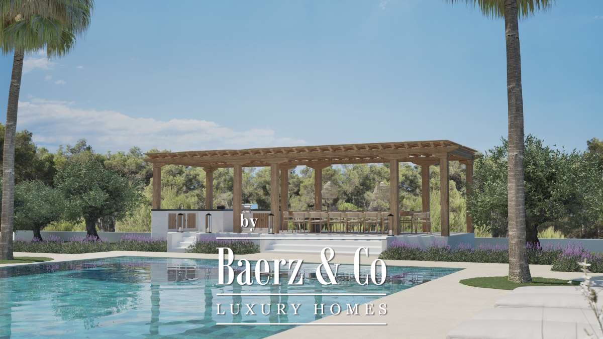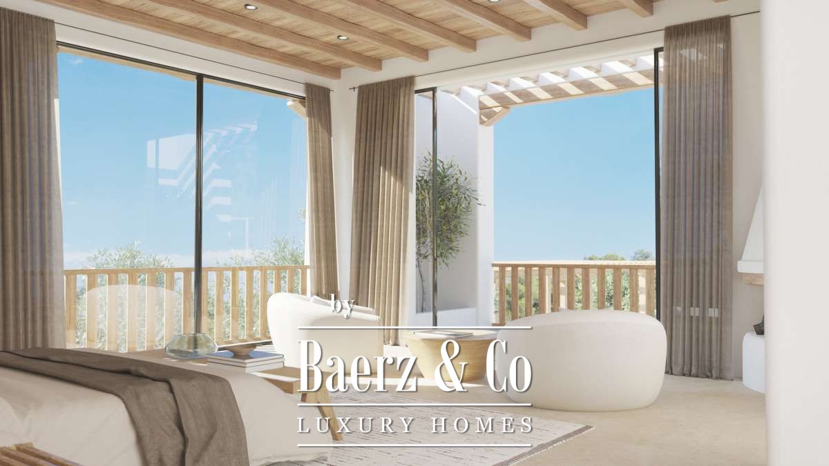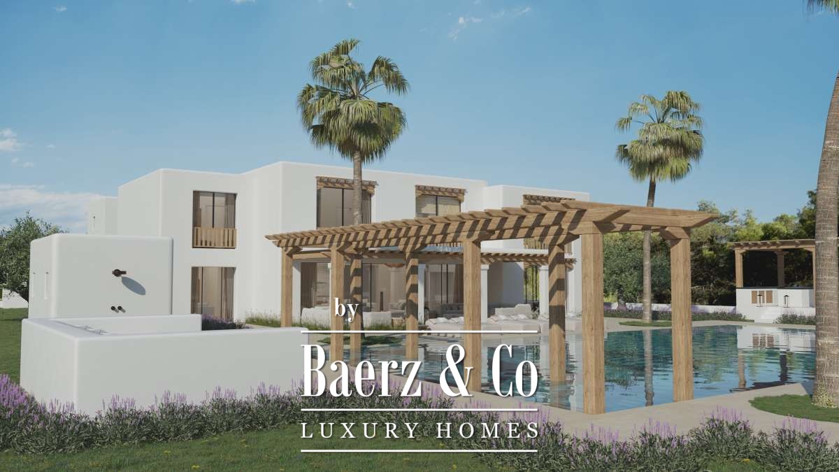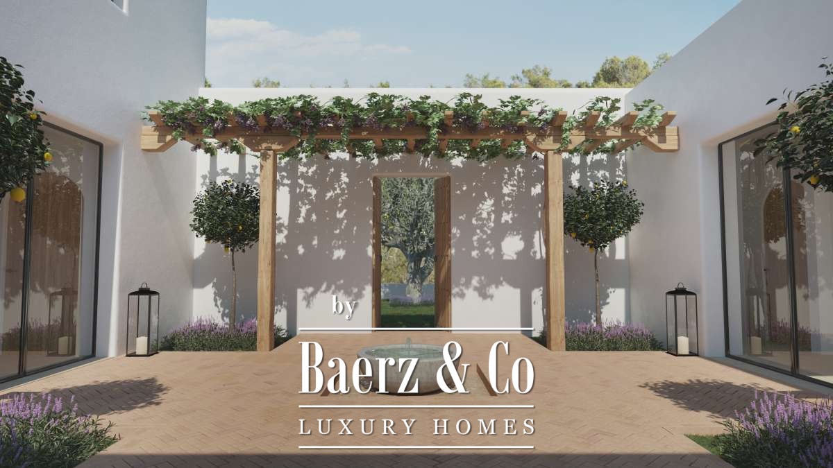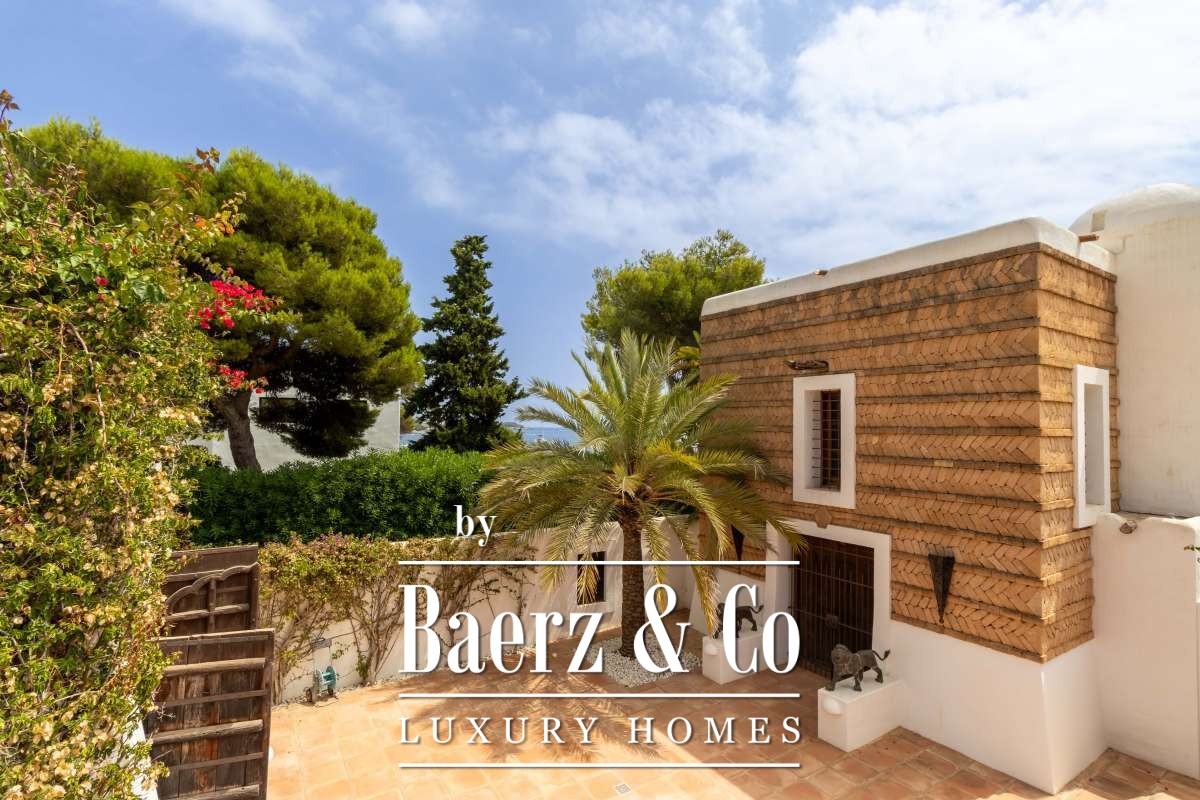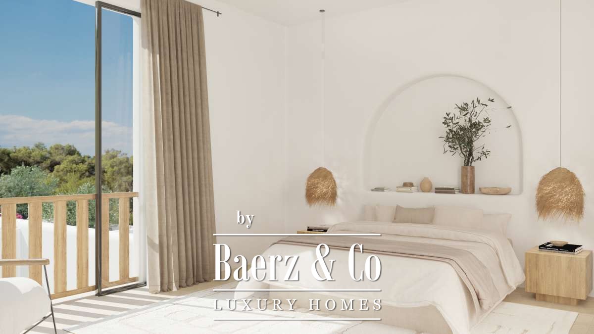 in the background. It also comes with a large ensuite bathroom. The other bedrooms also have their own balconies with the spectacular garden views, making it a dream to wake up in your own private paradise. The house also comes with air conditioning and heating to keep room temperatures comfortable in any season. Noteworthy, the main characteristics of this magnificent property will be maintained, but renovated with a beautifully new interior design project from Blakstad.The outdoor spacesThe centerpiece of this lush and tropical garden is the remarkable 246m2 large swimming pool. Take a refreshing dip in one of Ibiza’s most beautiful pools, and enjoy a private retreat in your own serene oasis. This garden is also ideal for entertaining and hosting guests with its many convivial and shaded terrace areas, decorated with its pink flowers. Be captivated by the magnificent sea views looking through the surrounding palm trees and the lush greenery, also providing extra privacy. On top of that, there is also a small pathway at the back of the garden, bringing you closer to the ocean in just a few steps. In addition, the front garden offers a large piece of land for agriculture. Entering the property, you will find an automatic gate with a luxurious two-lane driveway, where you can comfortably drive in and park your car in the shaded parking space at the end of the roundabout. There is ample space for more cars to park, making it very convenient and secure when receiving guests or family. Embrace the Ibizencan lifestyle and enjoy the perfect blend of a traditional modern design with exquisite amenities in this majestic villa.