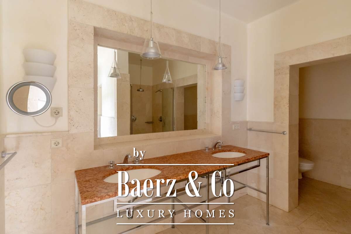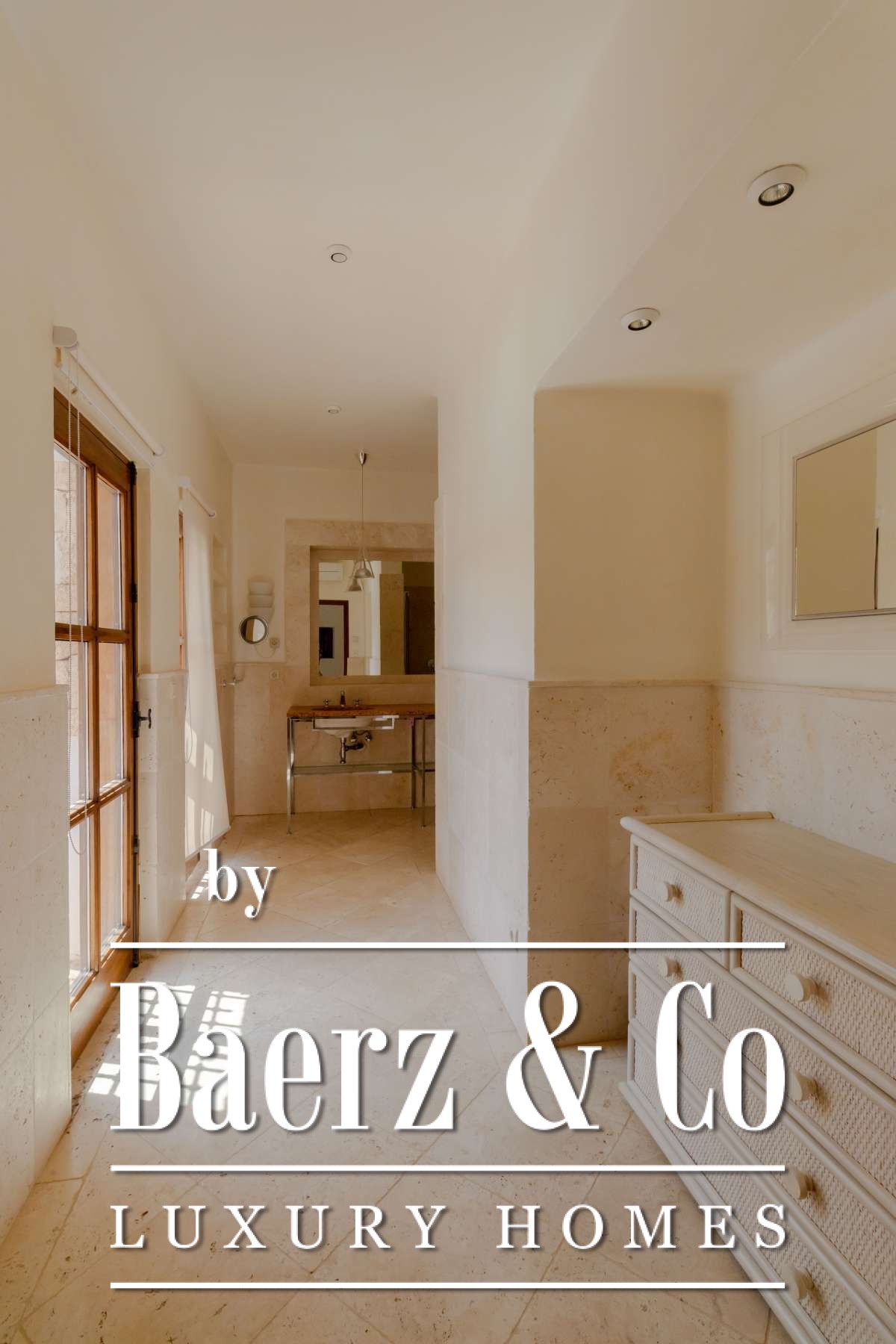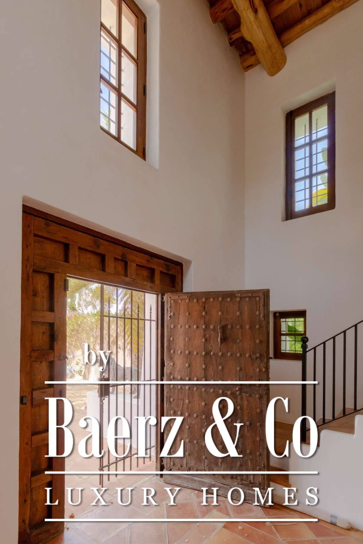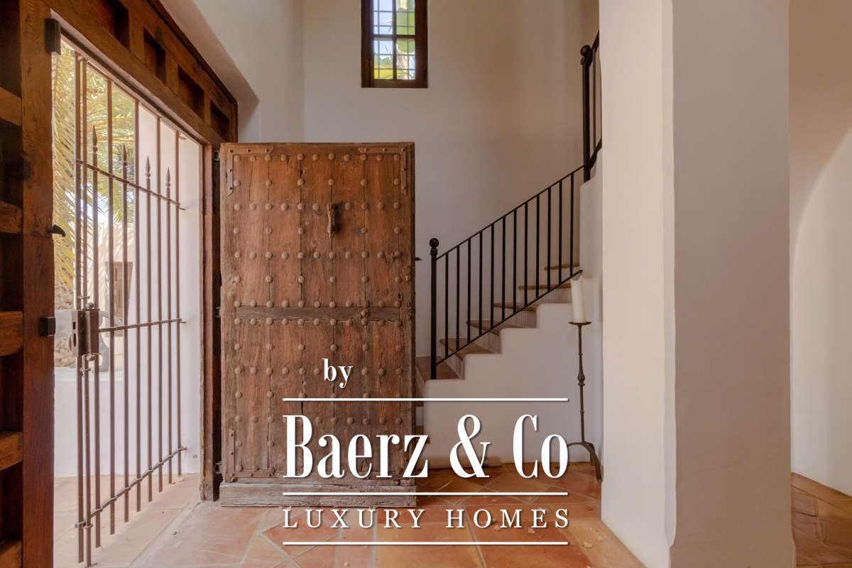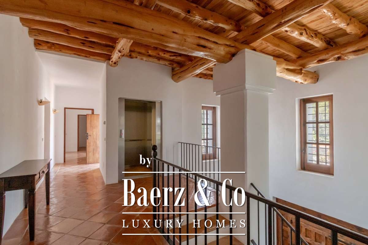 The surroundingsThis impressive majestic villa is located in one of the most beautiful and tranquil east-coastal areas of Ibiza, offering panoramic sea views through the garden and from the terraces. Enjoy absolute privacy in this extraordinary plot. You will be a stone's throw away from the picturesque beaches Es Canar, Playa Niu Blau and many more. Also, the popular cristalline beach Cala Nova is only a 10 min drive away. Here you will find well-known classy beach restaurants such as Atzaro beach, Aiyanna and the culinary high-end restaurant Etxeko in the Bless hotel. For more entertainment, the famous Ibizan hippie markets Las Dalias and Punta Arabi are also just a few minutes away by car. The vibrant Eivissa old town is just 30 minutes away and the airport is reachable in 35 minutes. This beautiful finca is a true gem located in the middle of Ibiza’s chic east-coast, offering you a true paradisiacal lifestyle.The villaThis gigantic property has a 540m2 built living space spanned over a generous 5.631m2 plot. Upon entering the hall, you will find traditional stairs and the warm wooden beams on the ceiling that give the house character. The open plan living room has a traditional fireplace, and is perfectly connected to the garden with its many floor to ceiling windows. There is a large corner kitchen with a separate door to the garden as well. To make the house more comfortable, certain practical features are added such as a walk-in fridge in the grand kitchen, and a modern elevator in the hallway. Moving upstairs, the master bedroom has a beautiful balcony overlooking the tropical garden and magnificent pool, with the ocean