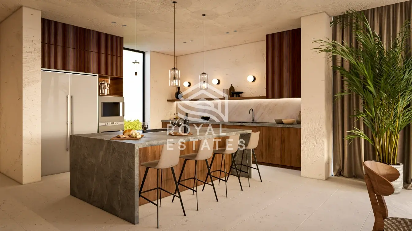 The main living area opens to the light, blending interior and exterior through floor-to-ceiling bi-fold doors and an inviting terrace. The lounge includes a fireplace, and the adjacent kitchen offers natural stone worktops and high-end appliances, complemented by handcrafted cabinetry. In the master suite, a private terrace, walk-in wardrobe, and spa-inspired bathroom with a carved stone bathtub create a restorative sanctuary. Additional en-suite bedrooms reveal open views through glass doors that connect seamlessly to the natural surroundings.