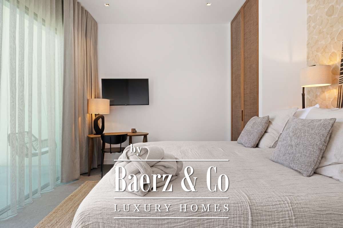 Outdoor living defines Modern villa Can Furnet. The main pool, styled with an integrated jacuzzi and bordered by palms, sets a spa-like tone. Multiple sun lounges, a Bali bed, and integrated seating create zones for relaxation. Ascend to the rooftop terrace to experience panoramic vistas and a second infinity pool, ideal for private entertaining or quiet evenings against the backdrop of Dalt Vila’s skyline. Parking, a secure, fenced perimeter, immaculate finishes, and a fully furnished handover provide immediate ease for those seeking an exclusive lifestyle villa in Ibiza’s vibrant heart.