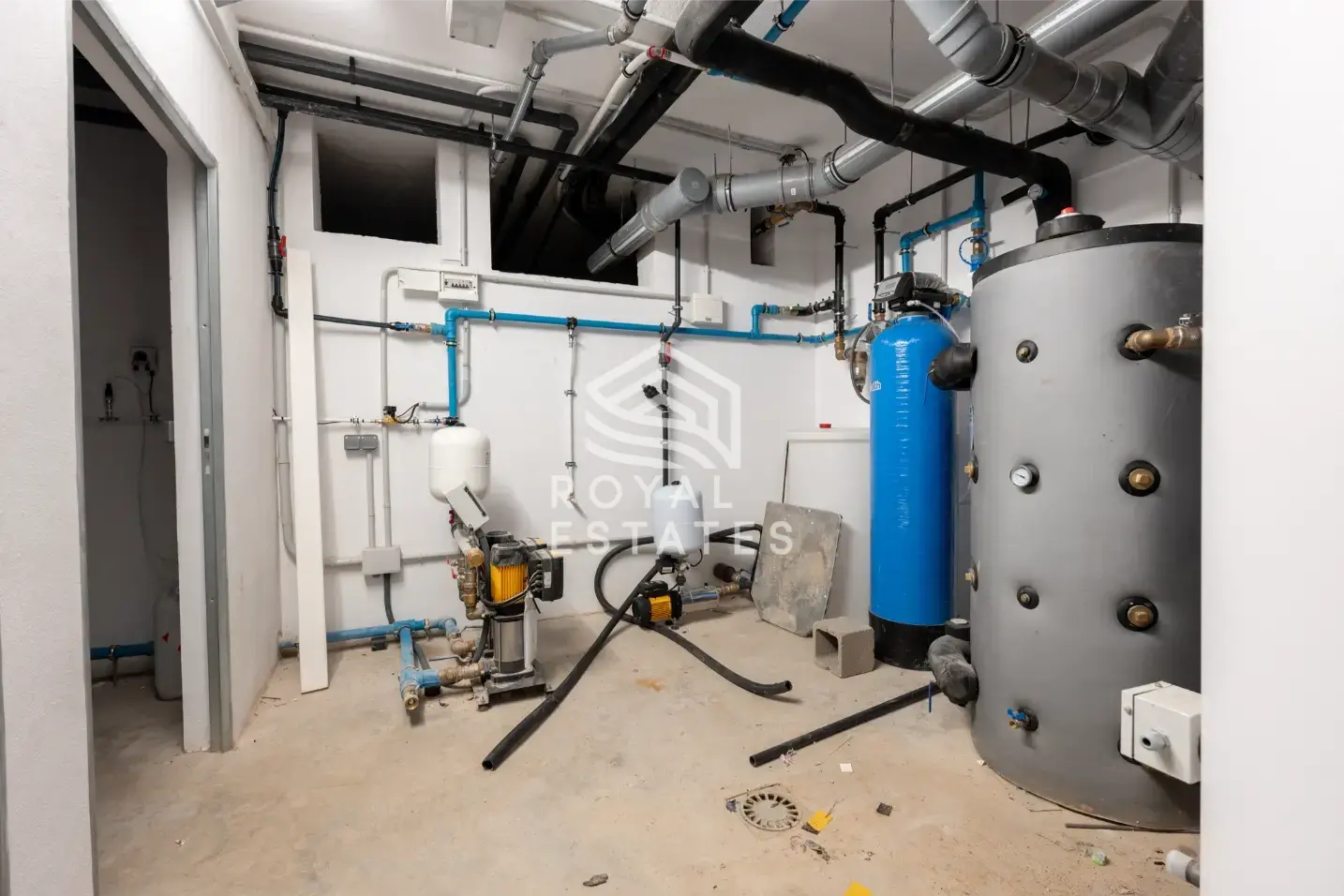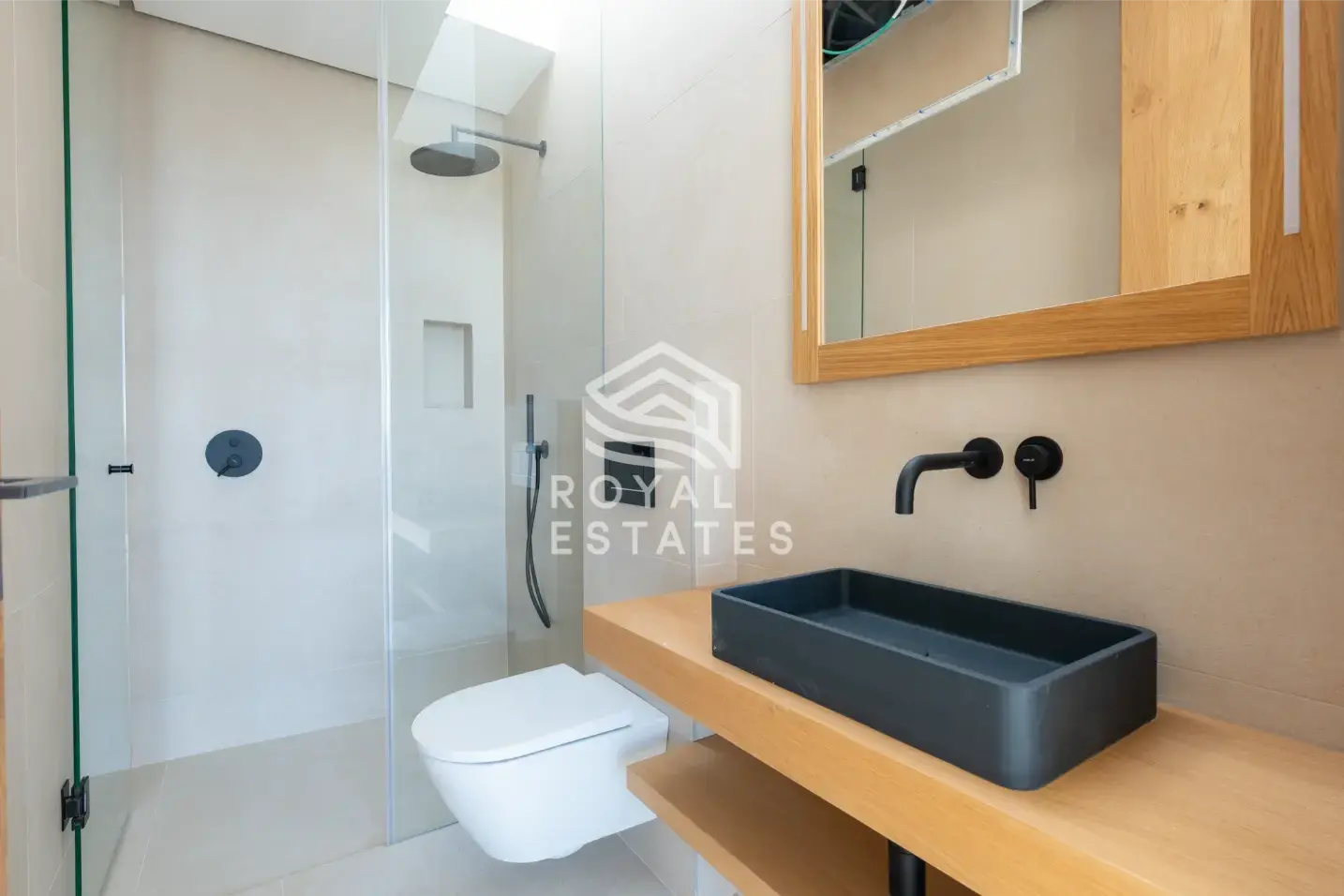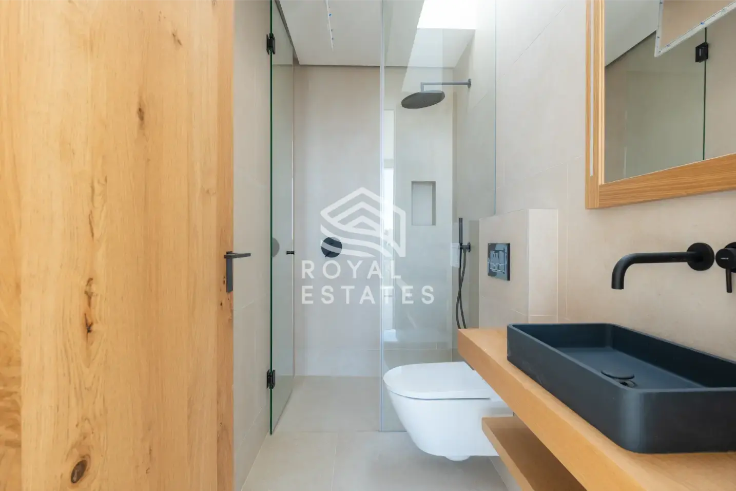 The open plan ground floor includes a large living area and kitchen, flowing directly to the gardens and pool. Six bedrooms are arranged on the upper level, all with en-suite bathrooms and built-in wardrobes, each inviting views of the sea and Dalt Villa, reinforcing the unique Ibiza setting. Modern finishes extend to underfloor heating, central air conditioning, and a notable 172.87 m² basement—ready for a home cinema, gym, or guest apartment.