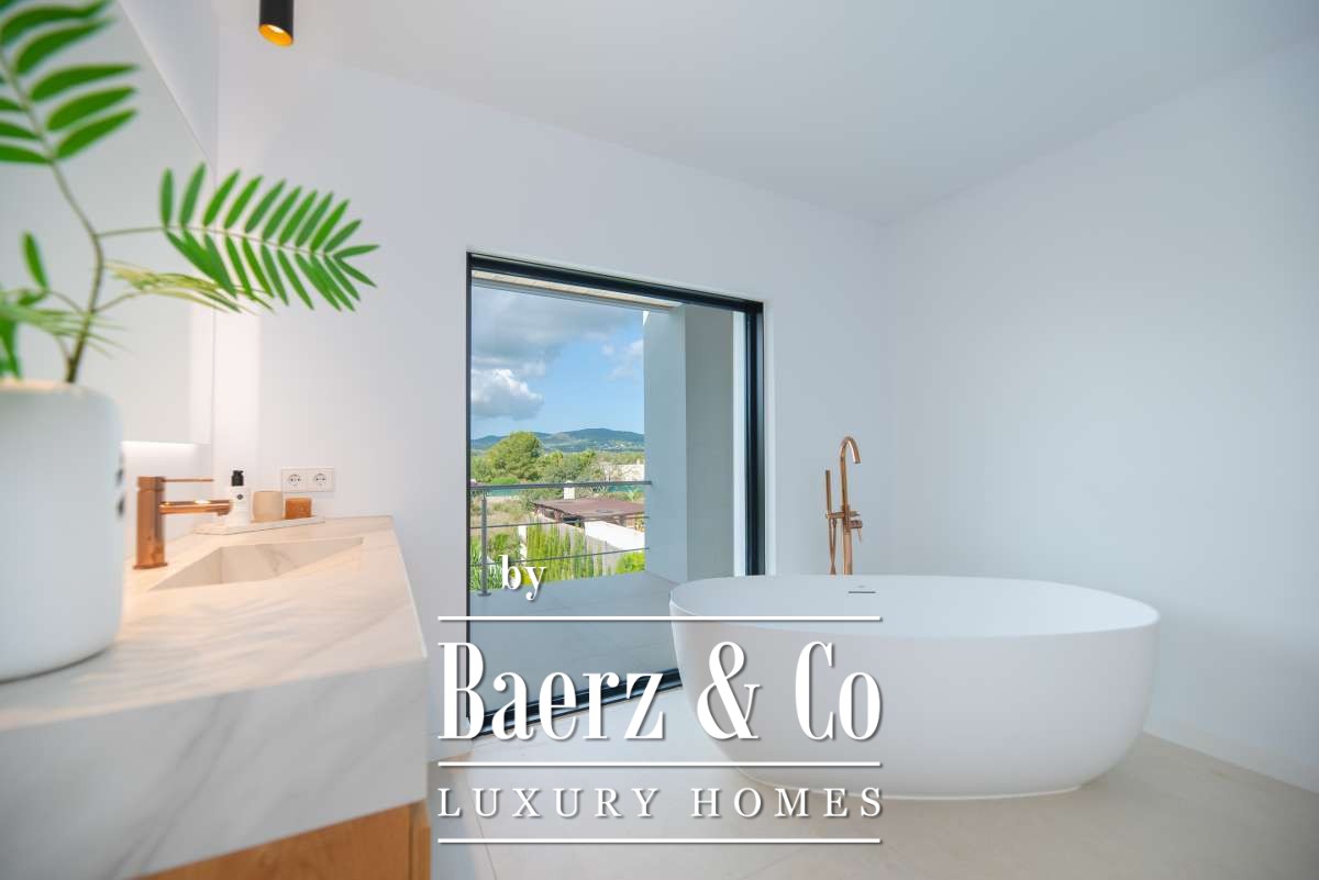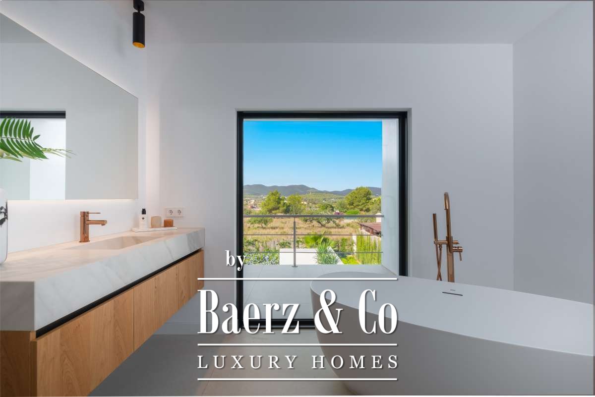 Light flows through an open-plan living and dining room, anchored by a modern fireplace. The space is defined by tactile finishes—sleek marble, gold accents, and floor-to-ceiling glazing—opening directly onto a south-facing terrace. Five bedrooms each offer built-in wardrobes and en suite marble bathrooms, while the master suite includes a freestanding bath overlooking the tranquil Ibizan countryside. The fully equipped kitchen, with a marble bar, creates a central gathering point for family or guests.