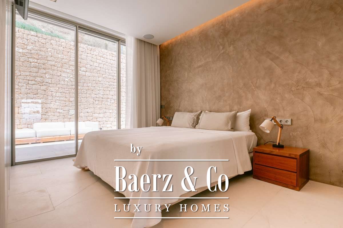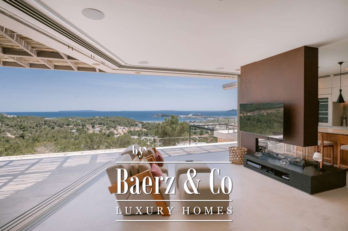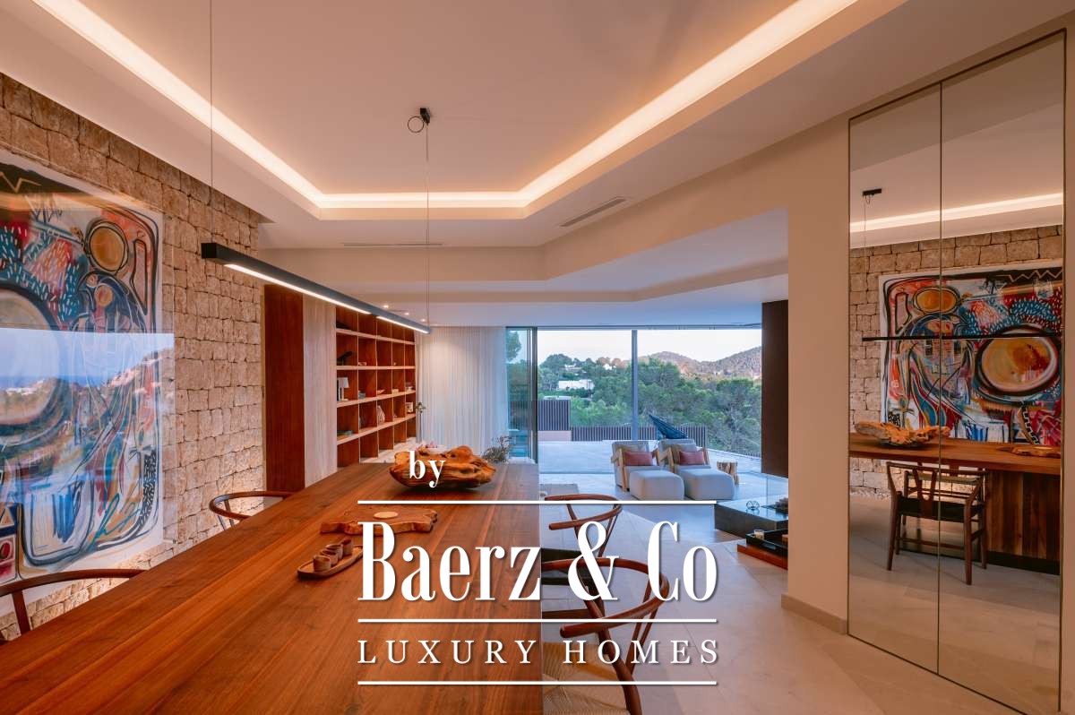 Natural stone and wood elements introduce warmth upon entry, leading to an open plan living area with seamless transitions between lounge, dining, and a Gaggenau-equipped kitchen. Floor-to-ceiling windows capture the changing light, delivering exceptional sea, Dalt Vila, and Formentera vistas. Contemporary comforts include underfloor heating, domotics, air conditioning, electric curtains and shutters, and a striking modern fireplace.