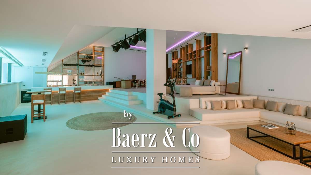 Entertainment possibilities are affirmed with a private nightclub and cinema—complete with underwater pool views and custom lighting—alongside multiple terraces and a rooftop lounge offering panoramic perspectives across Ibiza Town and the Mediterranean. The 2,220 m² plot incorporates an alluring swimming pool, alfresco bar, and several open-air lounge and dining areas for gatherings under the sun or stars.