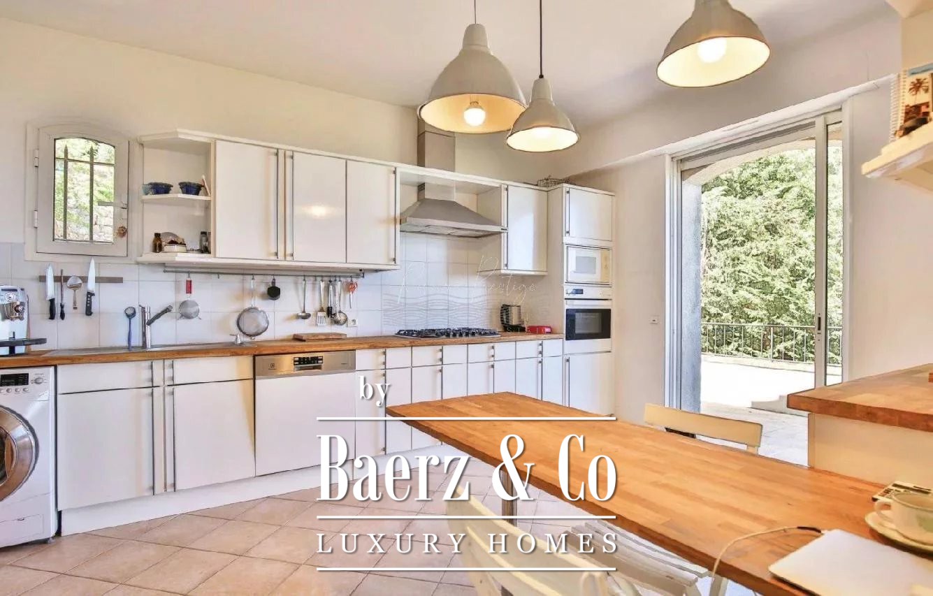 a sea view and access to the terrace. On the garden floor a master suite and three other en suite bedrooms with access to the terrace. Landscaped garden of about 2,000 sqm with a swimming pool. A garage and an independent flat complete the facilities of this beautiful family villa.