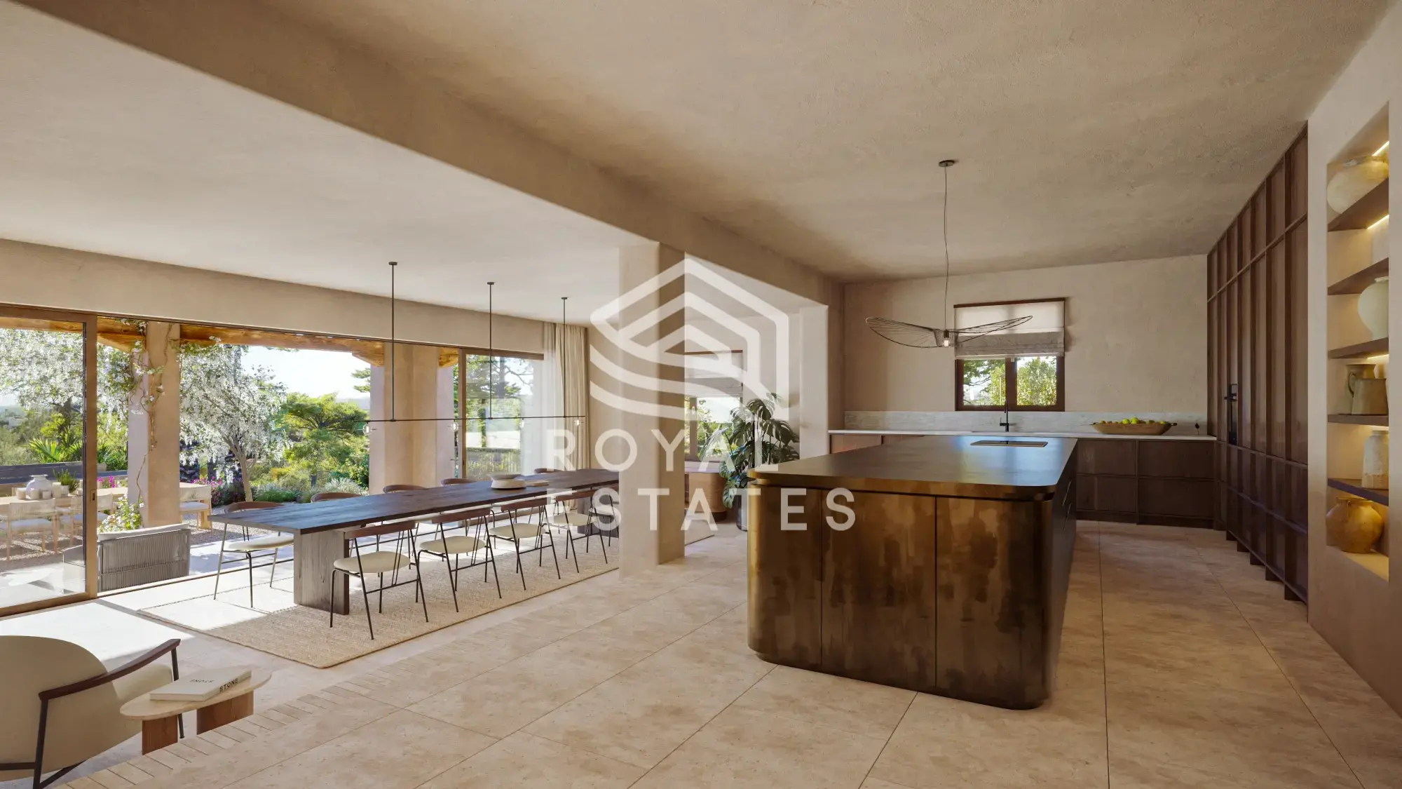 Outdoor living is shaped by a shimmering pool, a sun-drenched deck, and an alfresco dining area for intimate evenings or entertaining under starlit skies. The nearby beaches of Talamanca and Cala Roja are within easy reach, offering crystal water and sand. This villa Cap Martinet represents an uncompromising approach to island living—a rare opportunity for those who value architectural provenance, serenity, and understated luxury.