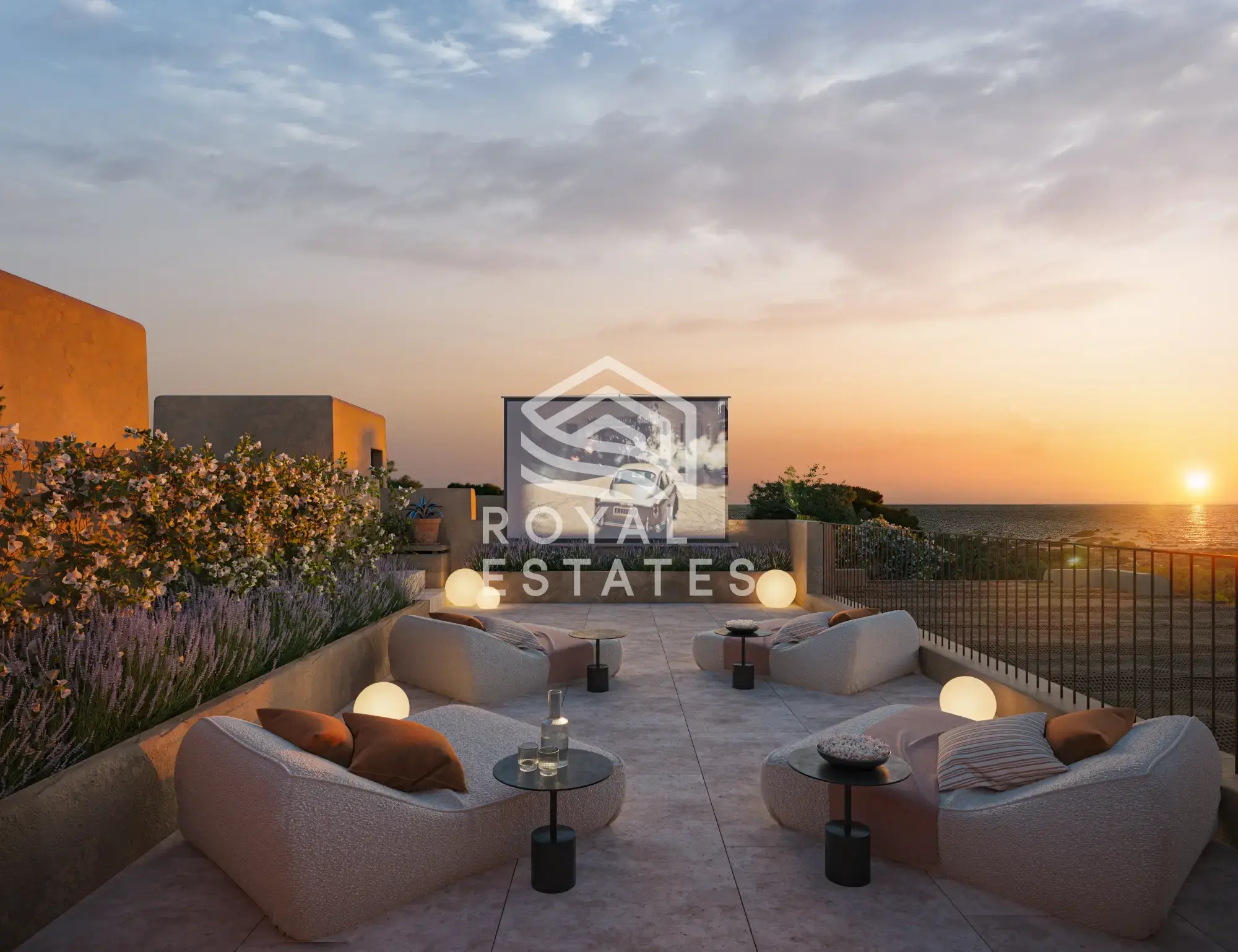 The kitchen is equipped with state-of-the-art appliances and generous work surfaces, catering to both quiet mornings and lively gatherings. Floor-to-ceiling windows establish a seamless relationship between inside and out, extending to meticulously landscaped gardens and multiple terraces, including a roof level with sweeping views across the sea.