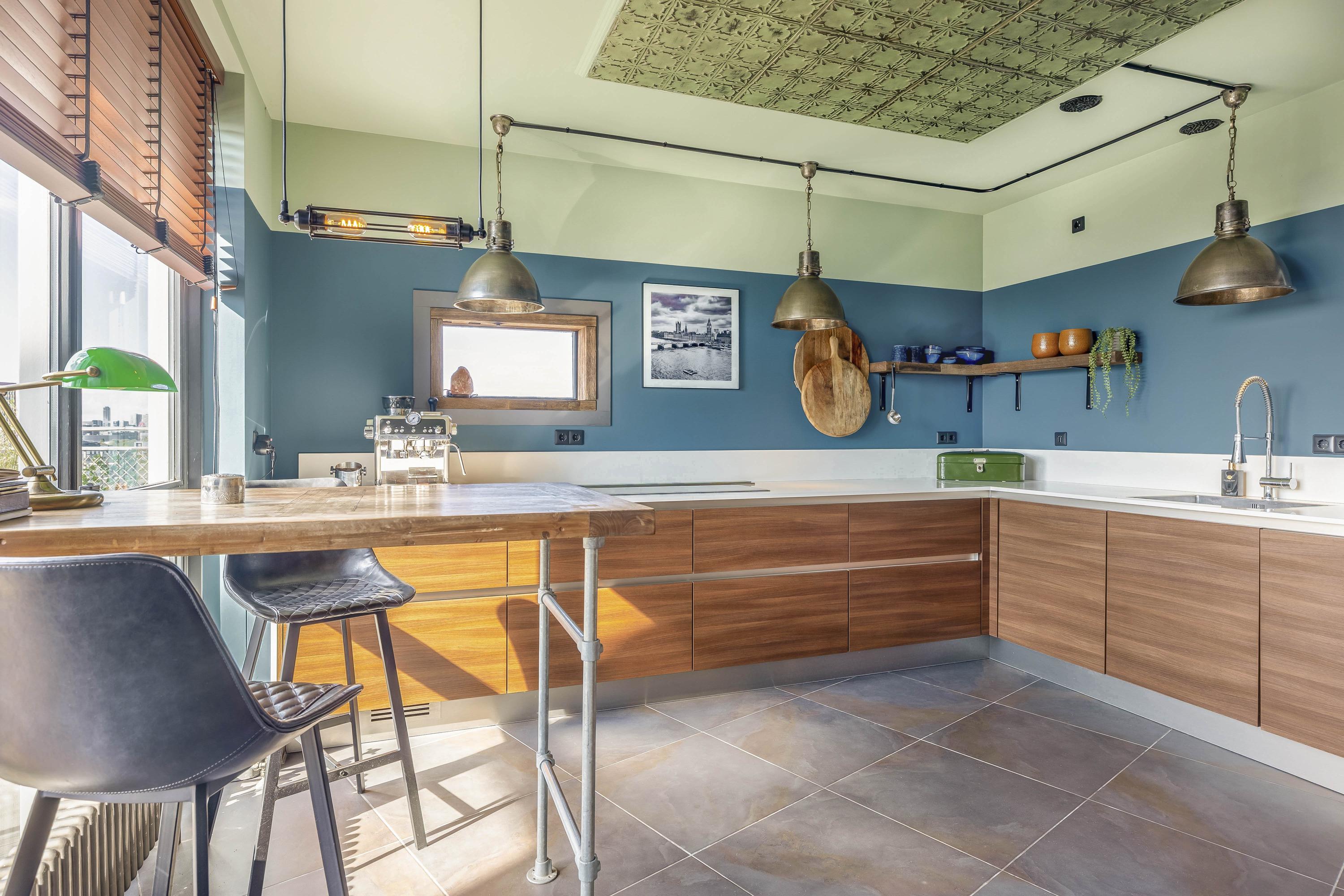 Entrance with wardrobe and guest toilet. The extremely spacious living room (85 m²) boasts incredible natural light thanks to a massive 7-meter-high window and an impressive mezzanine with an industrial-style balustrade. The entire floor is finished with luxurious Italian stone flooring and underfloor heating. On both sides of the living room, you’ll find expansive rooftop terraces, facing southwest and southeast respectively – 98 m² total. Enjoy all-day sun and phenomenal views. The skyline of Rotterdam feels almost within reach.