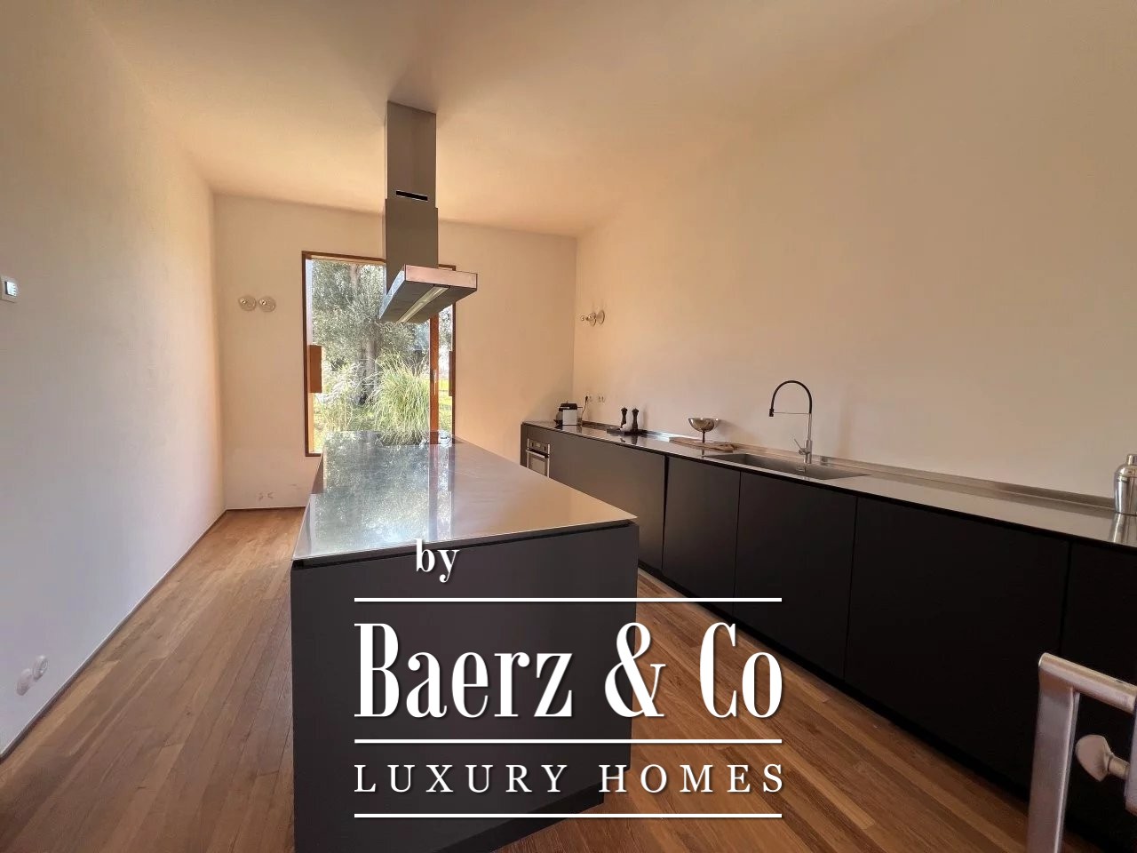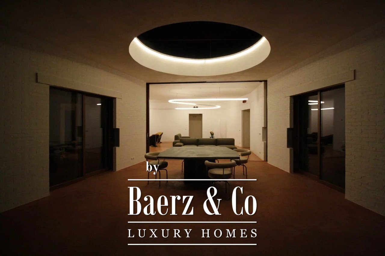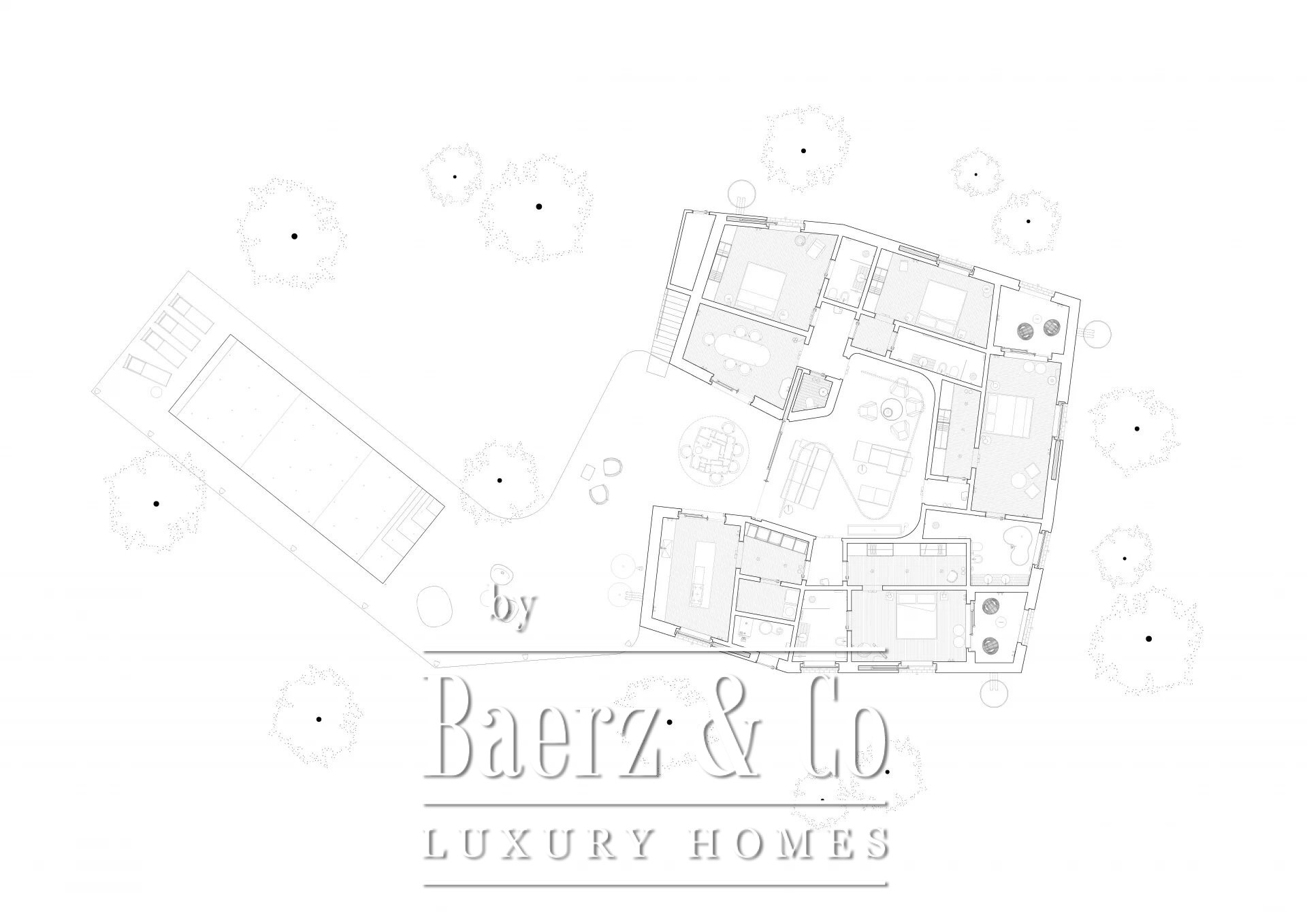 Centred around a bright living room - designed to hug its guests with its curved walls and open fire - the villa comes with four spacious bedrooms (two master suites and two junior suites) all of them with a private bathroom, a modern kitchen and a separate dining room. Among the kitchen, the dining room and the living room there is a second dining area located on the covered veranda which can be opened by a large, circular sliding roof that - like an eclipse - protects the table from the sun when necessary.