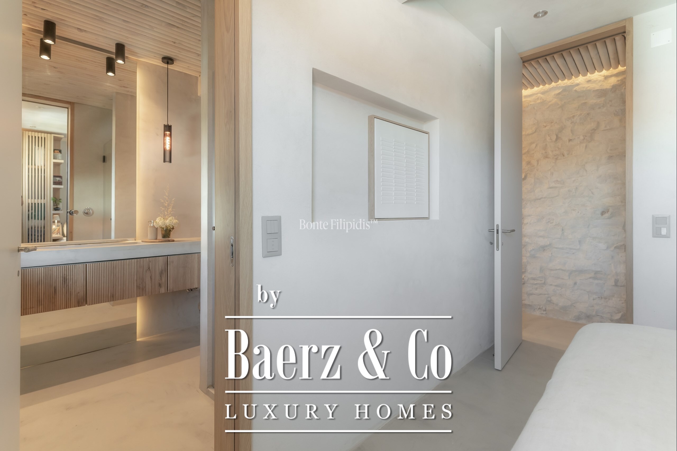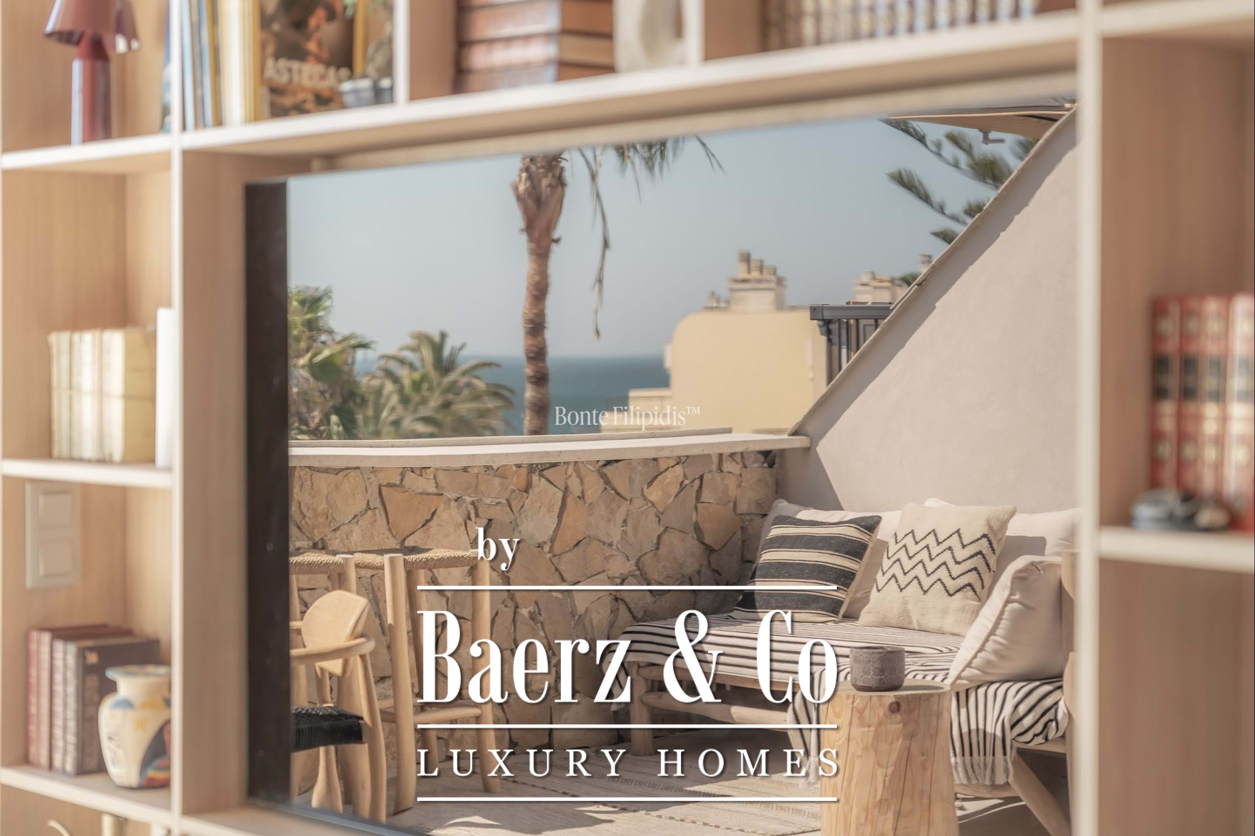 The 88 m² layout offers a seamless flow between the open-plan living room, dining area, and kitchen, all with high-quality finishes and fully integrated appliances. The living room leads to a 19 m² terrace featuring a bar as well as an outdoor shower for cooling off under the sky, offering a calm vantage over the bay. In the private area, the en-suite bedroom ensures privacy, while the second bedroom features sea views, its own balcony, and an independent, full bathroom.