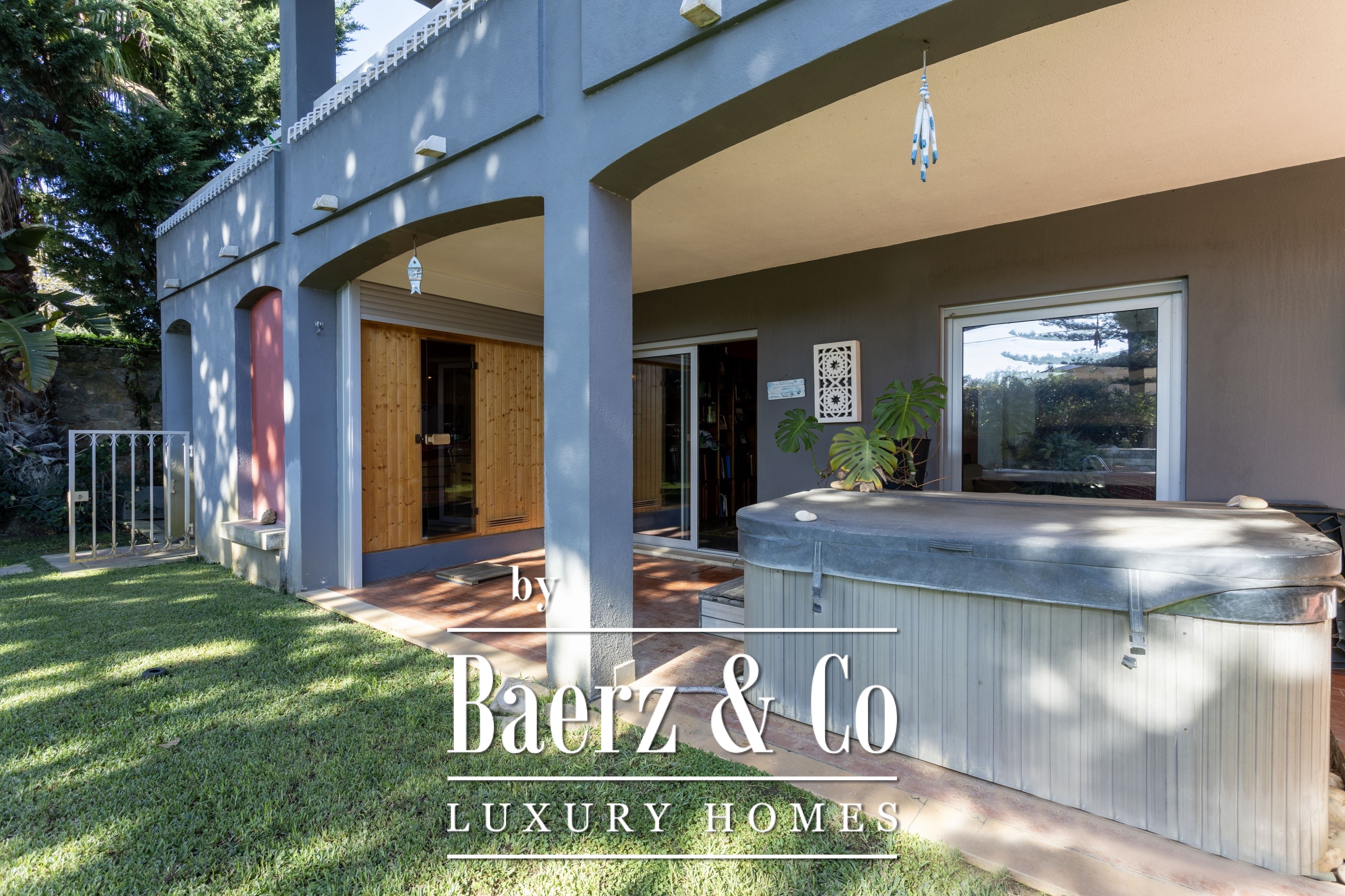 A self-contained 45 m² annex provides flexible use as a guest house. Wellness features include a three-person sauna, jacuzzi and direct pool access. The lower floor hosts a high-ceilinged living area, gym, office, and games room. Outdoors, the wooden deck transitions to a barbecue area and garden, watered sustainably via a borehole. Parking is secure for one vehicle in the garage and up to four within the gated area.