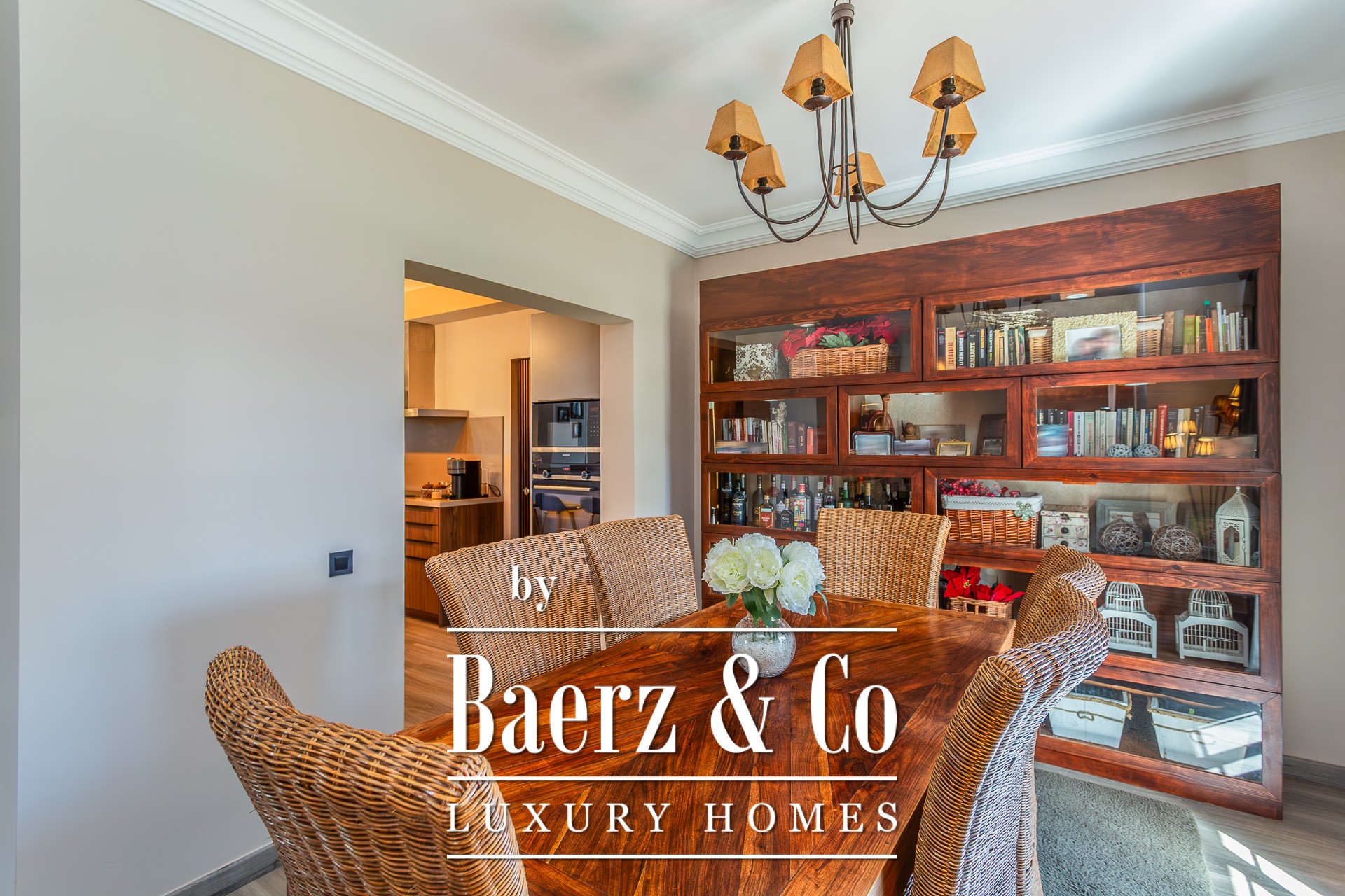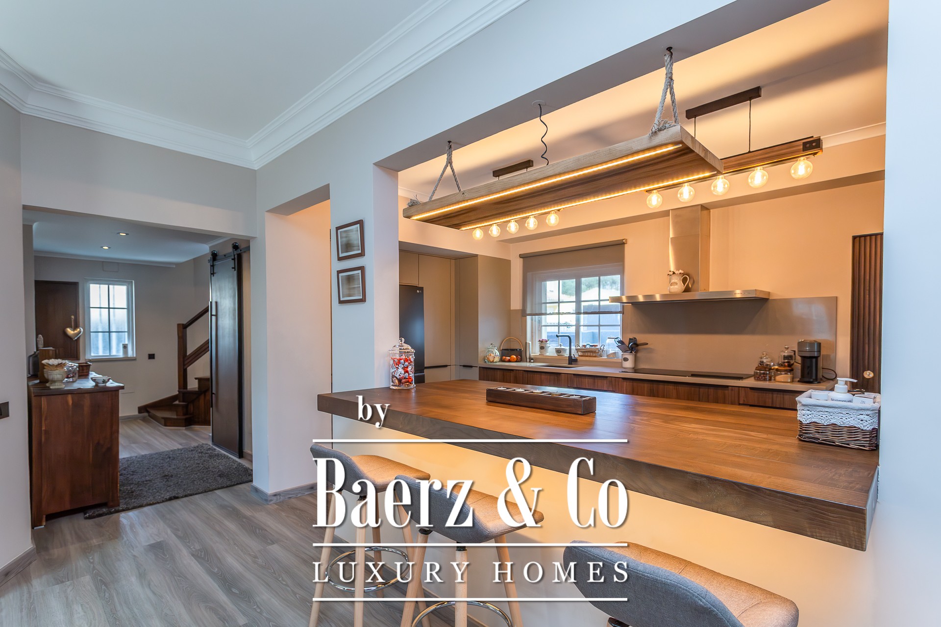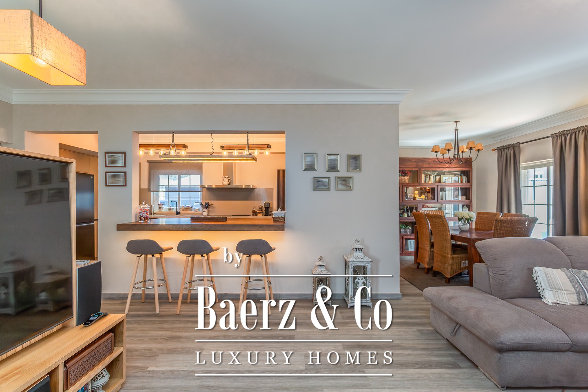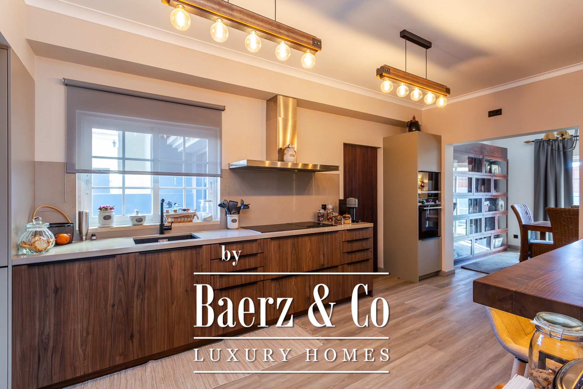 This charming detached 3+1-bedroom villa, located on a quiet cul-de-sac in Murches, offers privacy and comfort in a peaceful setting. On the ground floor, the residence features a welcoming entrance hall, a functional office, and a guest bathroom. The spacious living and dining area, complete with a fireplace, seamlessly integrates with the modern open-plan kitchen, the highlight of this home. Boasting a contemporary design and top-of-the-line appliances from the prestigious German brand Gaggenau, the kitchen provides a sophisticated and practical space for everyday living. All areas on this floor enjoy views or direct access to the garden, where the heated saltwater pool